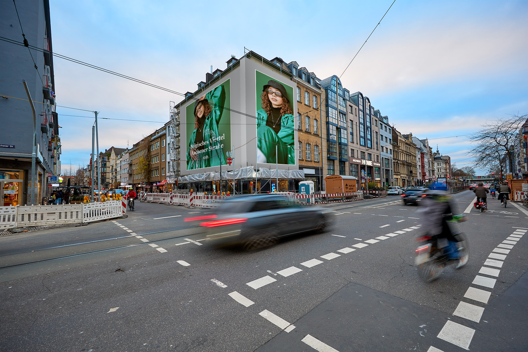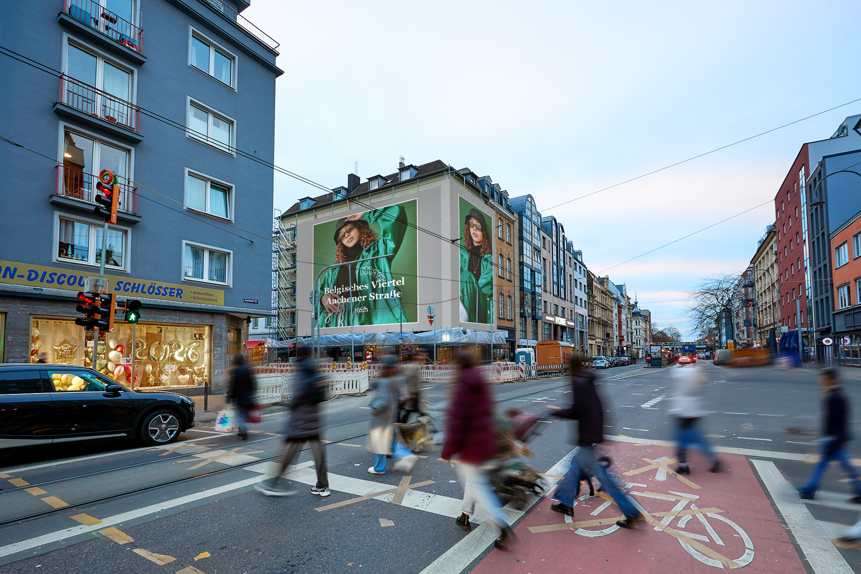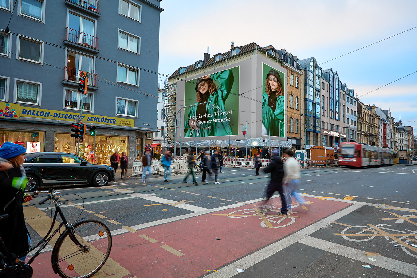 Between the city center, trendy spots and after-work venues: This Giant Poster, positioned across the corner, is located directly on the main road between inner city, the Belgian Quarter, and the west of Cologne, and is clearly visible from both Aachener Straße and Brüsseler Straße. Aachener Straße is one of Cologne's best-known nightlife and dining districts. Cafés, restaurants, bars, and clubs make it an urban meeting place from after work until late into the night. Whether it's rush hour traffic, shopping, or the way to the Belgian Quarter, this is where busy city life meets trendy lifestyle.
