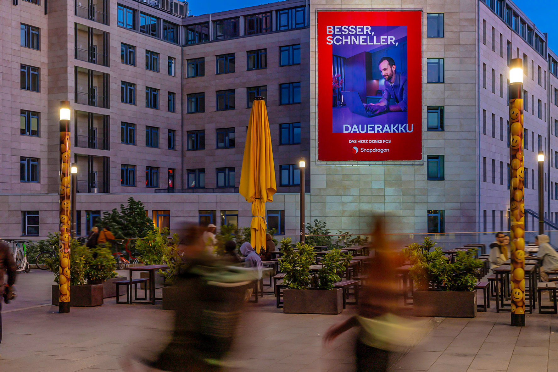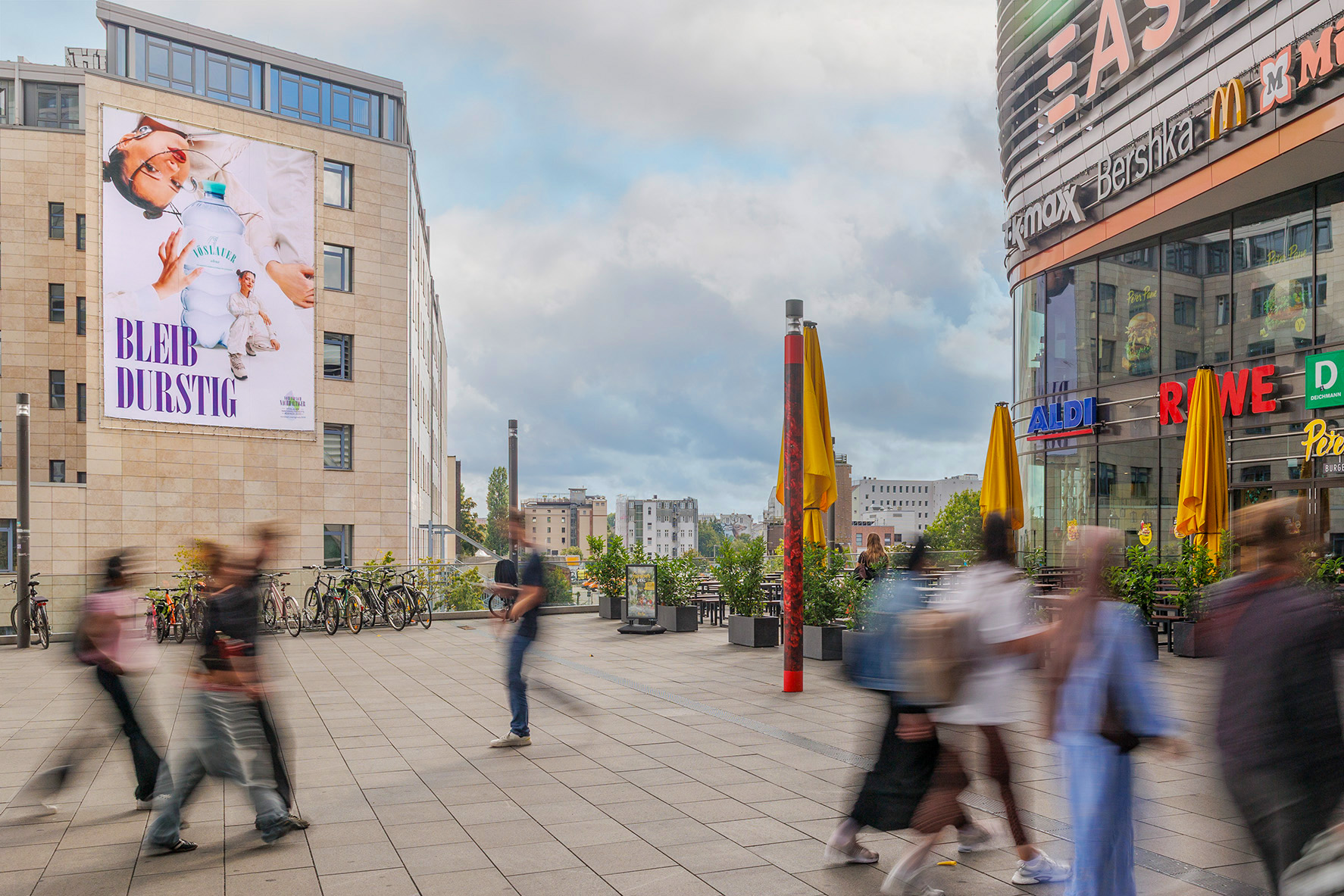 This BlowUP is located in the heart of Berlin's trendy Friedrichshain district on the Warschauer Brücke. It is located directly opposite the entrance to the East Side Mall, a trendy lifestyle shopping center that, with around 120 stores, is one of the city's major shopping centers and attracts a young, trendy shopping crowd. In addition, you will find Berlin's night owls here, who meet in numerous clubs and bars or event locations such as the Mercedes-Benz Arena, the Spreespeicher and the RAW site. Cultural highlights such as the East Side Gallery (the longest section of the wall designed by artists), trendy companies such as Universal Music, Zalando and MTV are in the immediate vicinity and also guarantee a creative and influential audience.