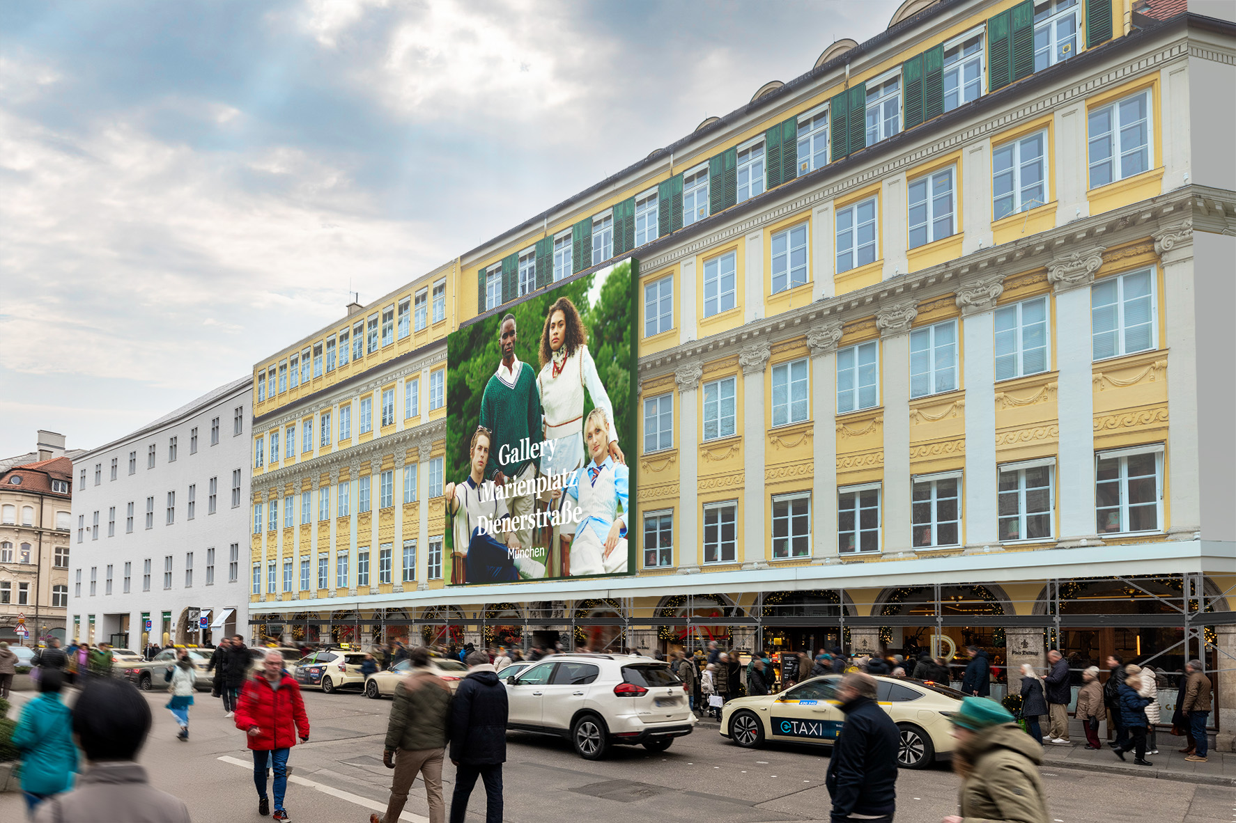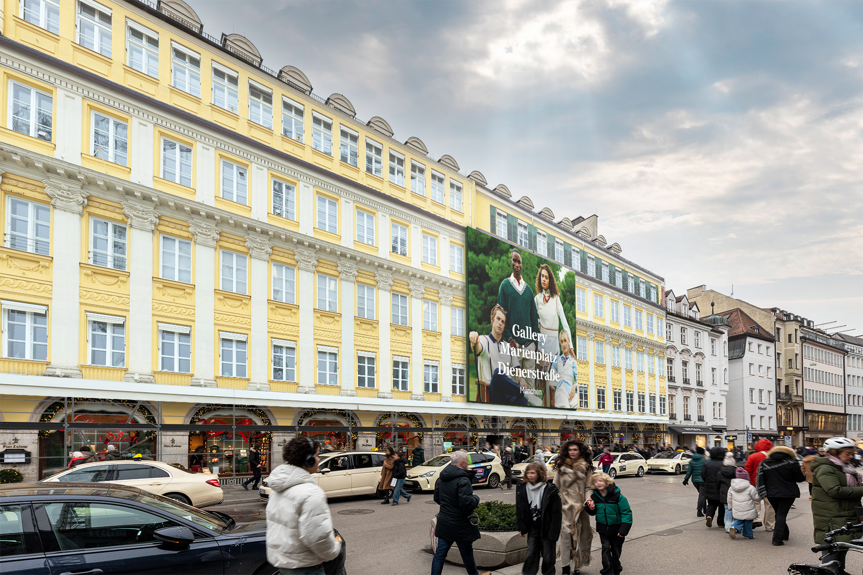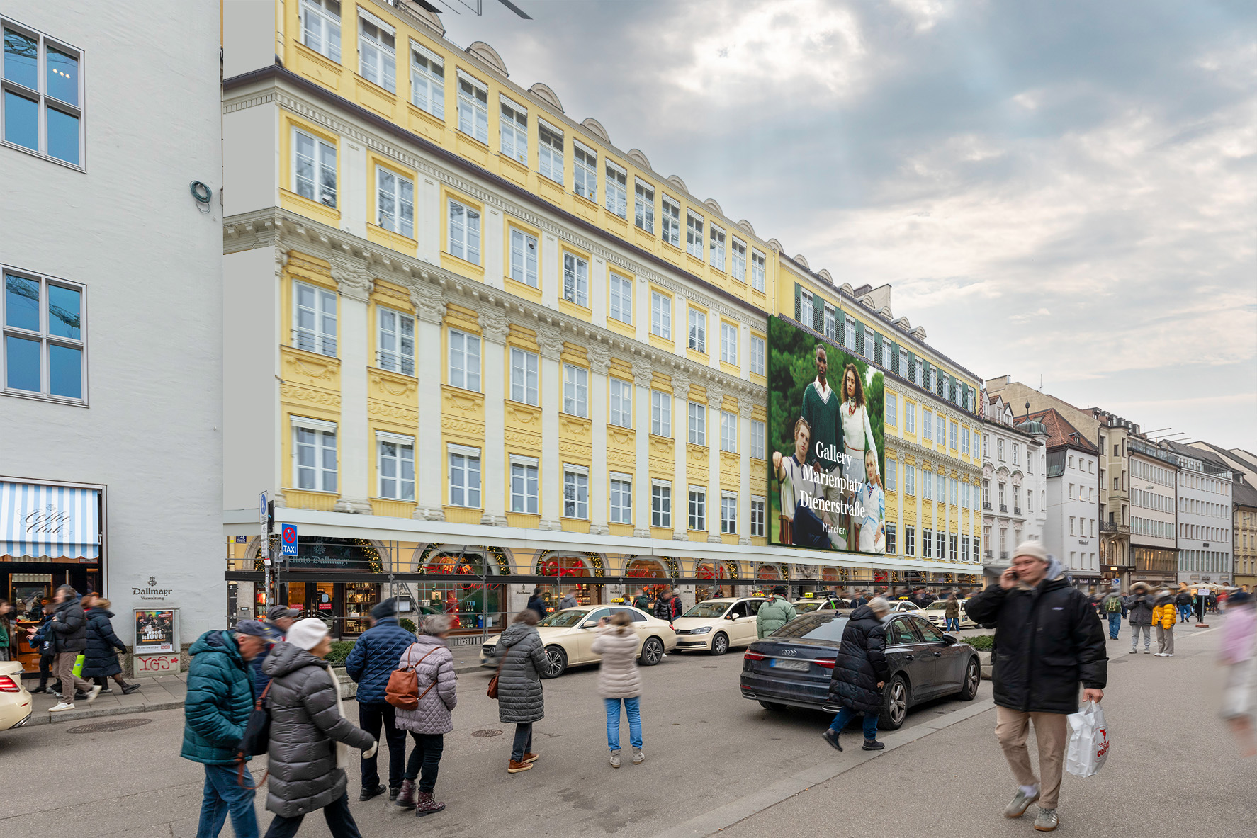 Our Gallery location transforms every campaign into a visual masterpiece. Giant Poster in a unique location on Dienerstraße in Munich: every day, thousands of fashion-conscious Munich residents make their way from Marienplatz to the exclusive Maximilianstraße in the old town. Surrounded by historic buildings and premium stores such as Louis Vuitton and Ludwig Beck, as well as the Dallmayr delicatessen, the Giant Poster reaches a style- and culture-conscious audience that lives for pleasure, fashion and urban lifestyle.