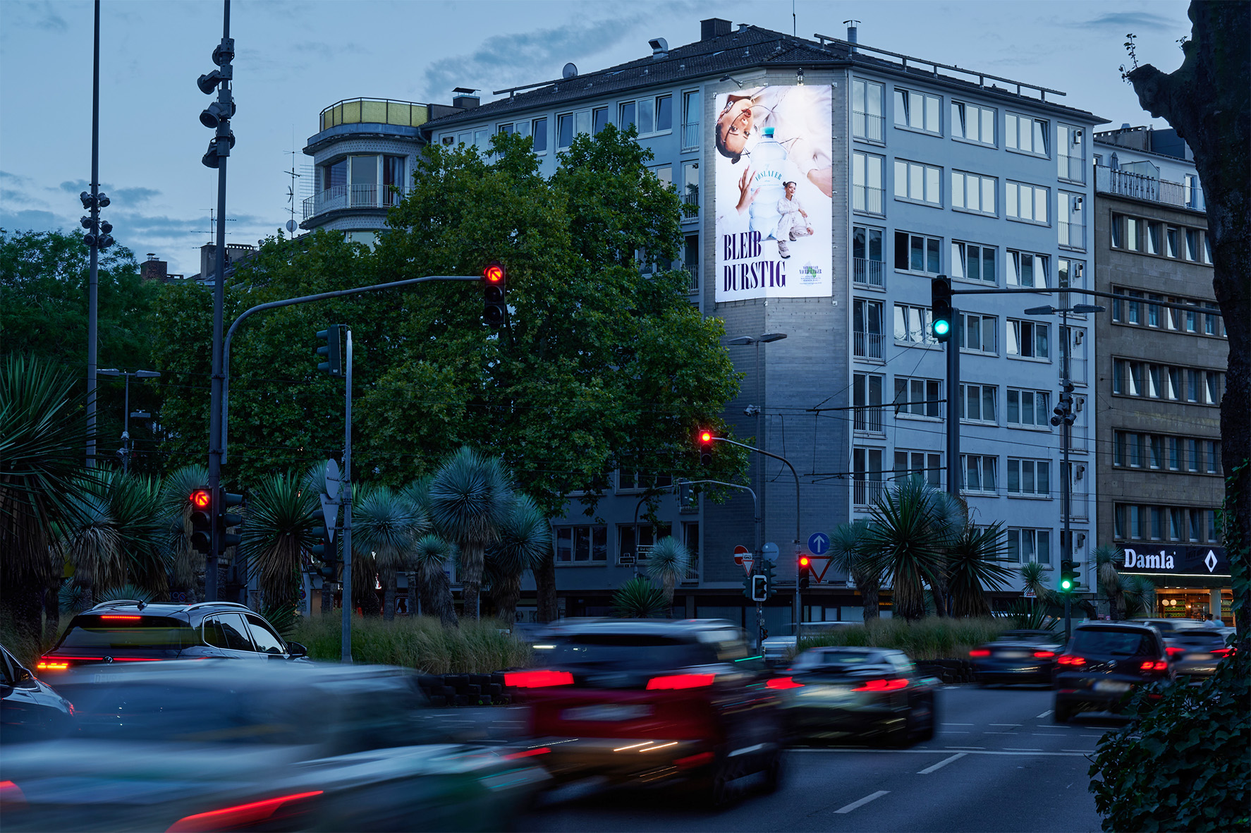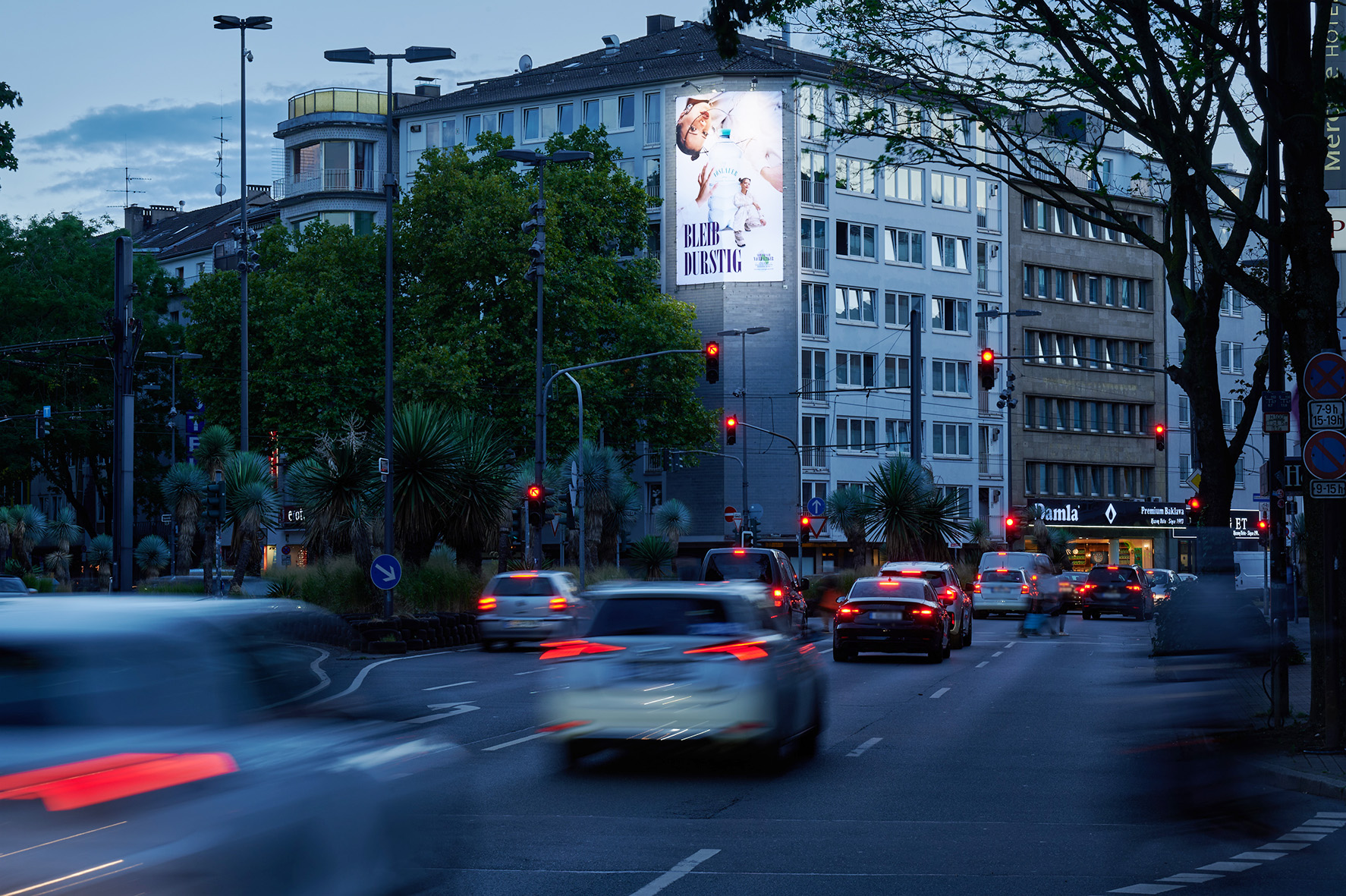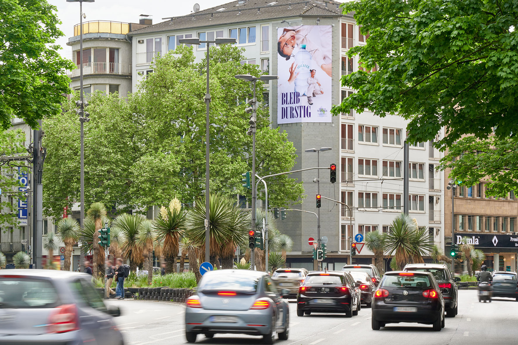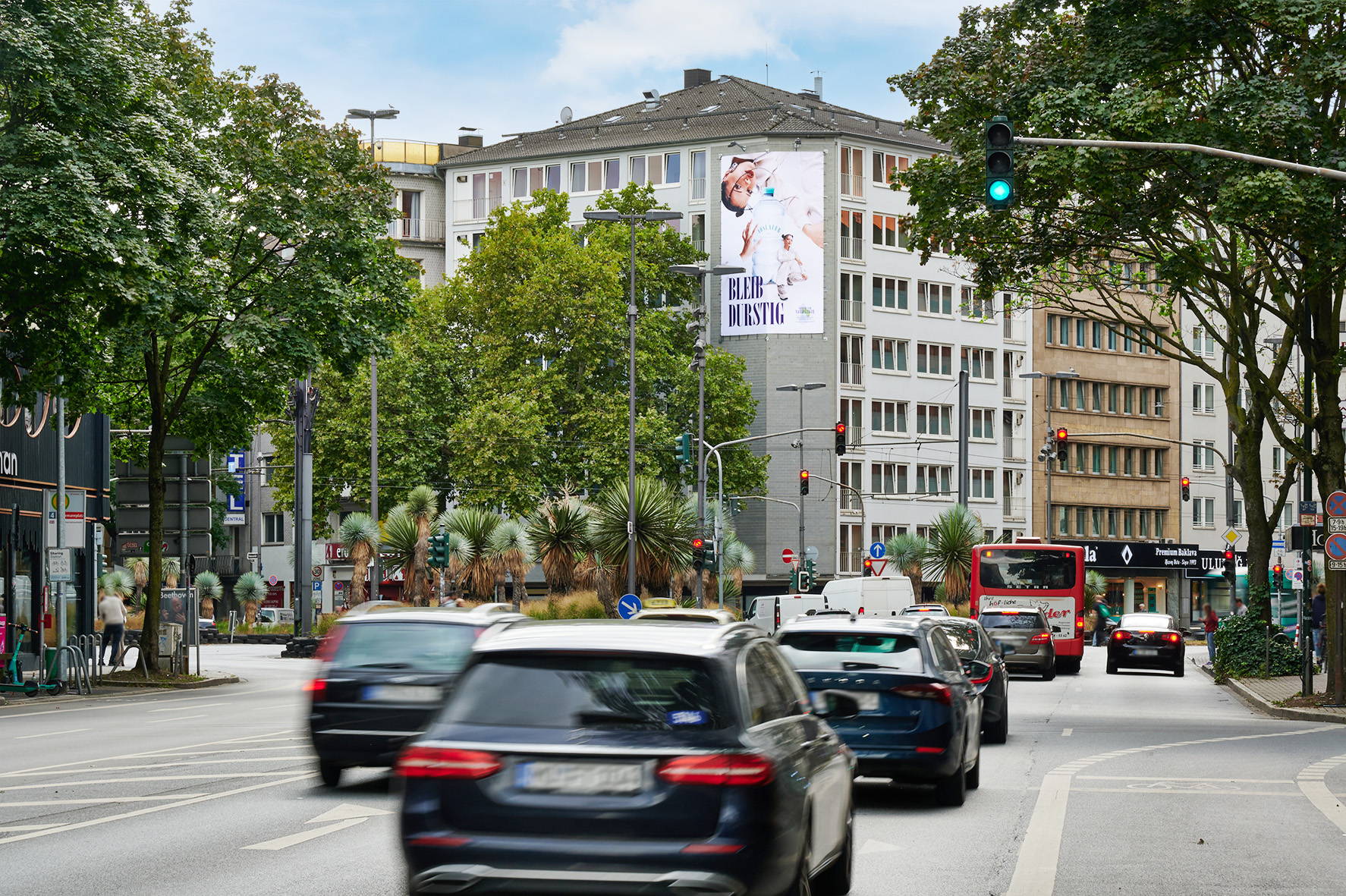 This Giant Poster is located at one of the most important traffic junctions and most frequented places in Düsseldorf: directly on Stresemannplatz, between the main railway station and the luxury boulevard Königsallee. There is a lot of traffic here at any time of day. The proximity to the city center and the main train station as well as numerous hotels and international cafés in the immediate vicinity make the area a popular destination for business professionals and Düsseldorfers who like to go out. In the immediate vicinity: the exclusive shopping experience center The Crown.