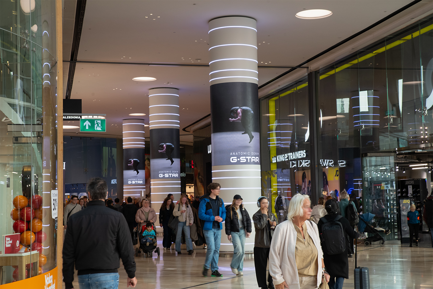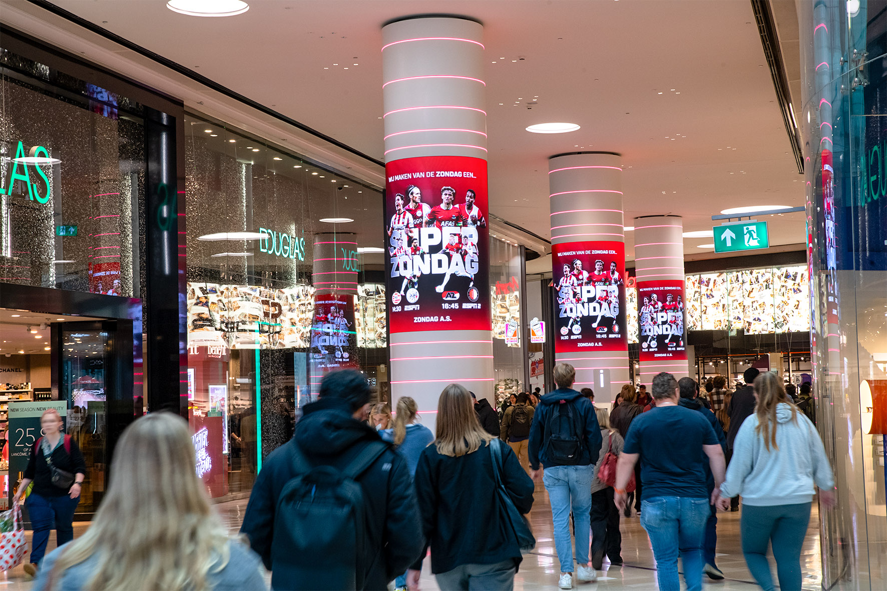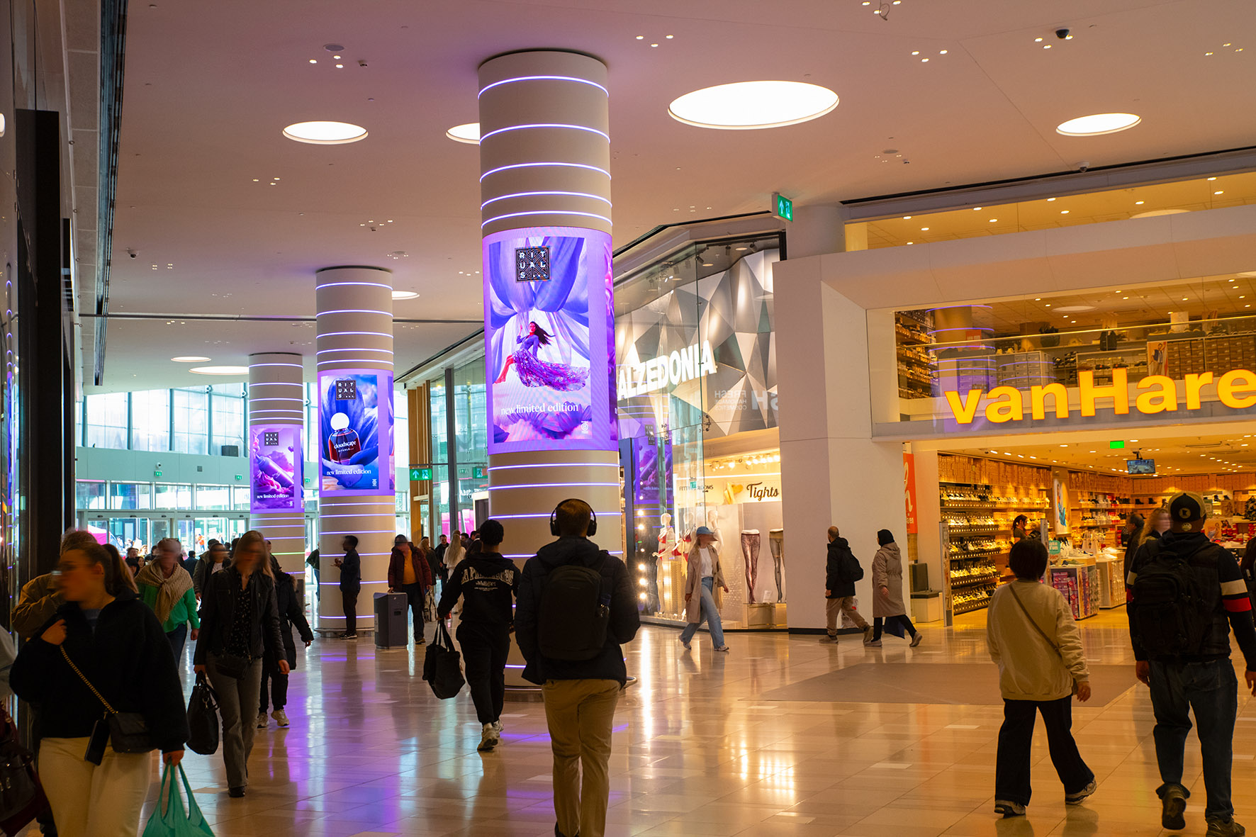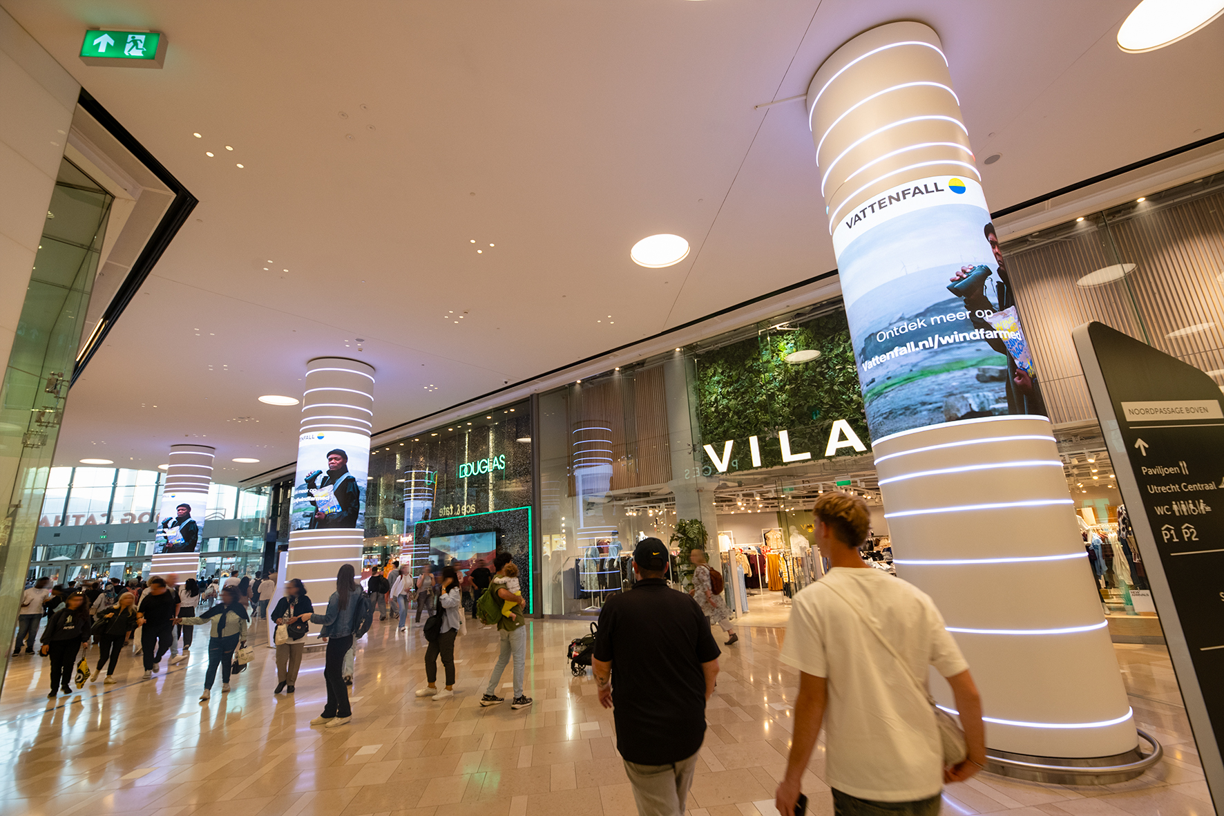 Pillars in Hoog Catharijne zorgen voor maximale zichtbaarheid in het drukstbezochte winkelcentrum van Nederland, met jaarlijks 35 miljoen bezoekers. Gelegen tussen Utrecht Centraal Station en het stadscentrum, trekken de schermen rondom de zuilen direct de aandacht bij binnenkomst. In de Noord- en Zuidpassage staan drie zuilen per zijde, waardoor het merk zichtbaar is in beide hoofdwandelroutes van het winkelcentrum. Deze 360° schermen bieden creatieve vrijheid en een indrukwekkende visuele impact. De dynamische LED-strips versterken het effect en maken de campagnes niet te missen. Op deze manier zorgen Pillars ervoor dat merken hun boodschap opvallend kunnen communiceren.