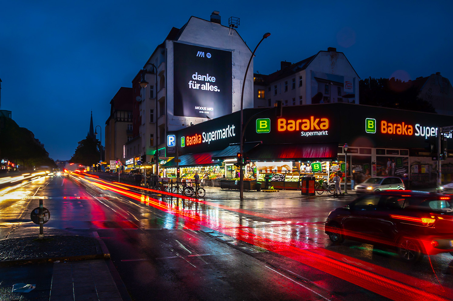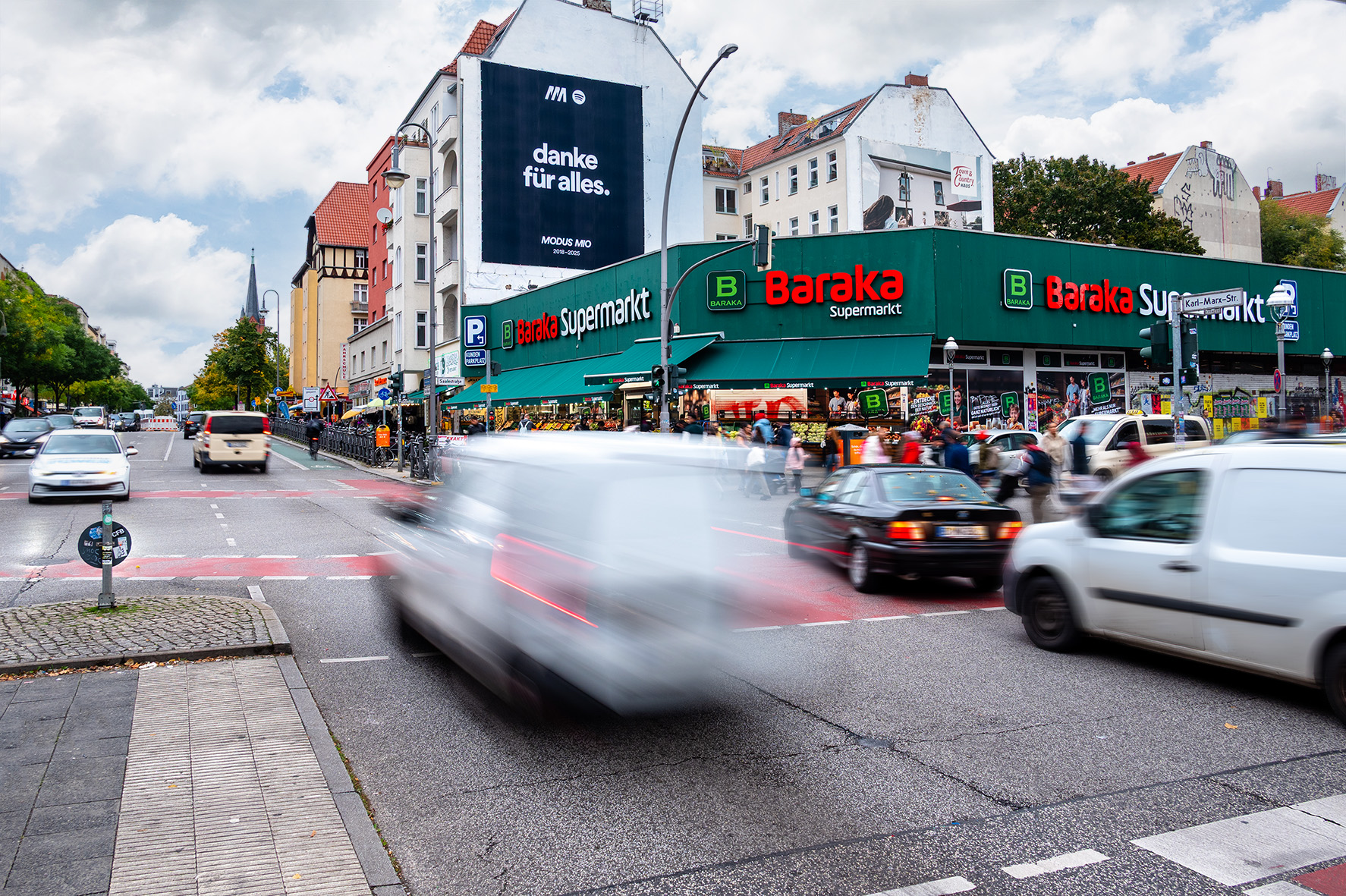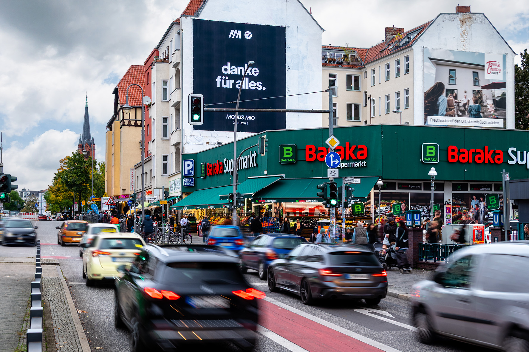 At the heart of fashionable Neukölln! This BlowUP is located on Karl-Marx-Straße, a highly frequented three-lane main road, and one of the city’s most important traffic junctures. It is a major route in and out of the city, directly connecting the city centre with the whole of southern Berlin, the region beyond and the A100 urban motorway. In recent years Neukölln has become a cultural hub. A lively club scene has sprung up around Reuterkiez, and small galleries and bars attract visitors to the capital, backpackers and students, who want to soak up Neukölln’s relaxed, shabby chic atmosphere, which is typical of Berlin. The area’s parks and green spaces also offer a pleasant break from urban life. Nearby Neukölln Arcaden, a broad range of restaurants and Berlin-Neukölln station all ensure additional traffic around the clock.