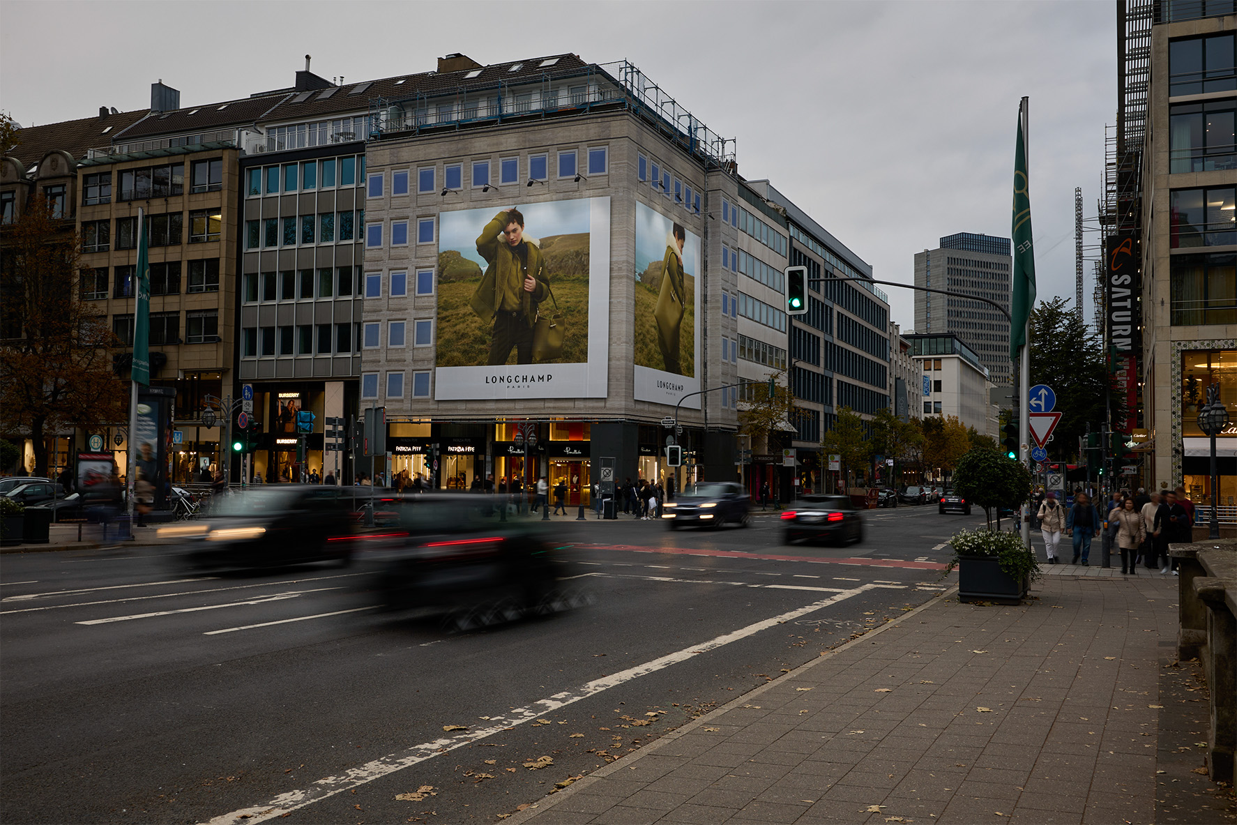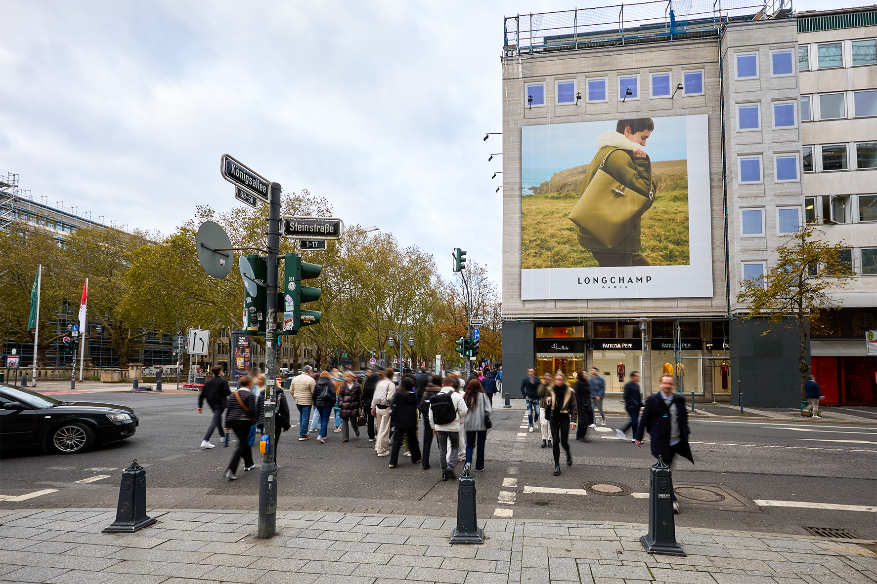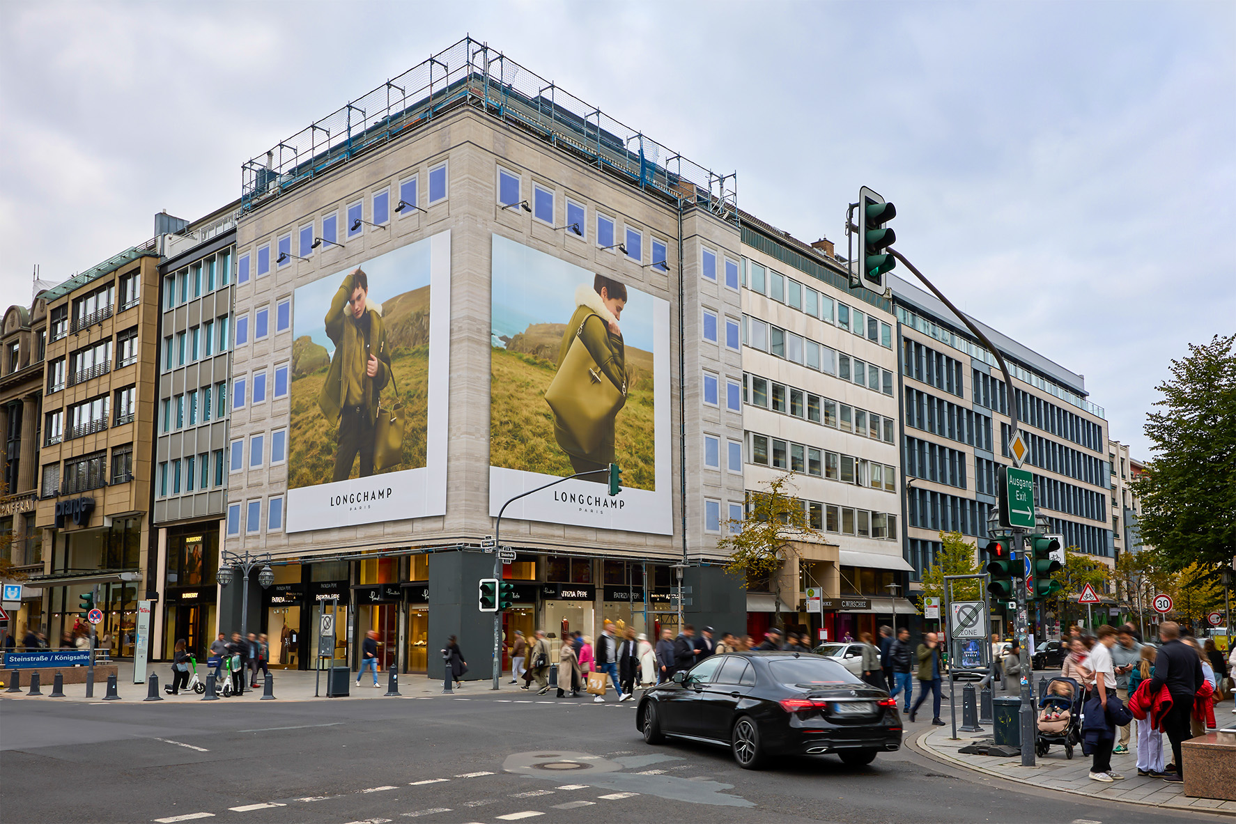 Premium location - this Giant Poster is located in the centre of Düsseldorf's famous Königsallee, the place to be for fashion-conscious for fashion-conscious shopping fans and trendsetters. More than 110,000 well-heeled Düsseldorfers and tourists pass through here every day. On the Kö, you can find high-quality brands such as Hermès, Chanel and Gucci in an exclusive environment. The Breuninger department stores' and the popular Schadowstraße shopping street are also within walking distance within walking distance. In the immediate vicinity: the renowned Breidenbacher Hof.