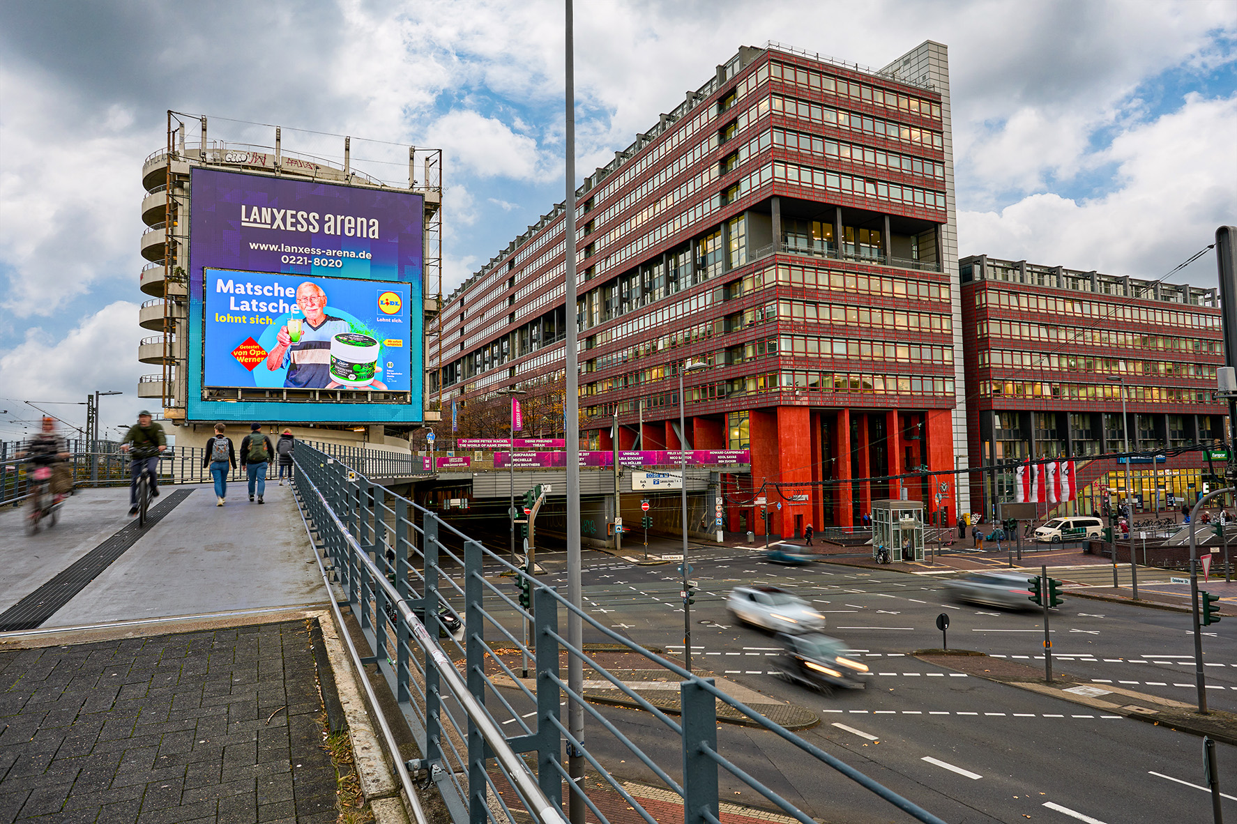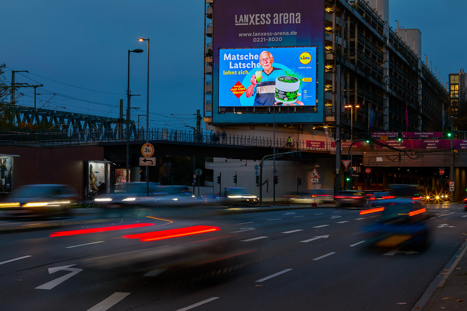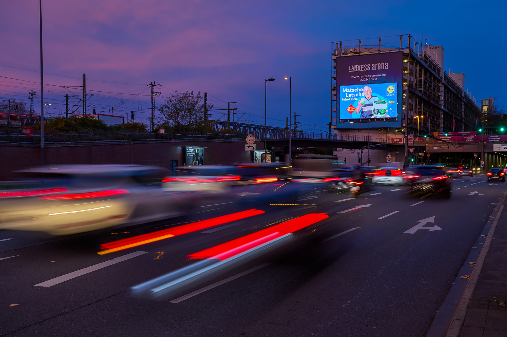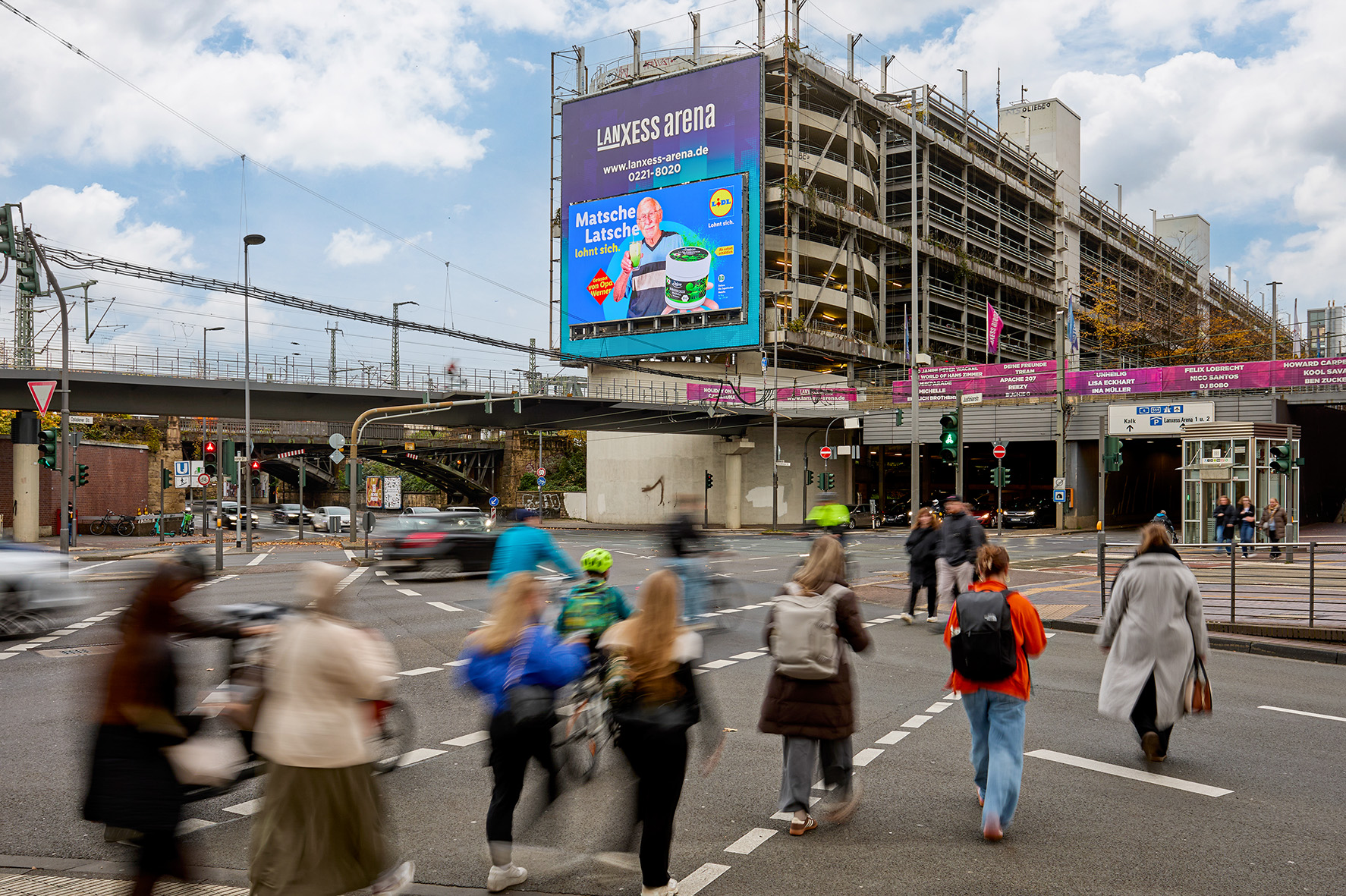 A milestone in Cologne: a nearly 100-square-meter LED highlight at the LANXESS Arena. Located directly at the transport hub in front of the LANXESS Arena and the Cologne Messe/Deutz ICE train station, this is one of Germany's largest DOOH screens. The screen, mounted on the parking garage facade of the LANXESS Arena, is visible from up to 300 meters away and also benefits from the traffic lights directly in front of it. Commuters head towards the train station, business professionals travel to the Cologne trade fair grounds, and night owls enjoy the diverse events at the arena.