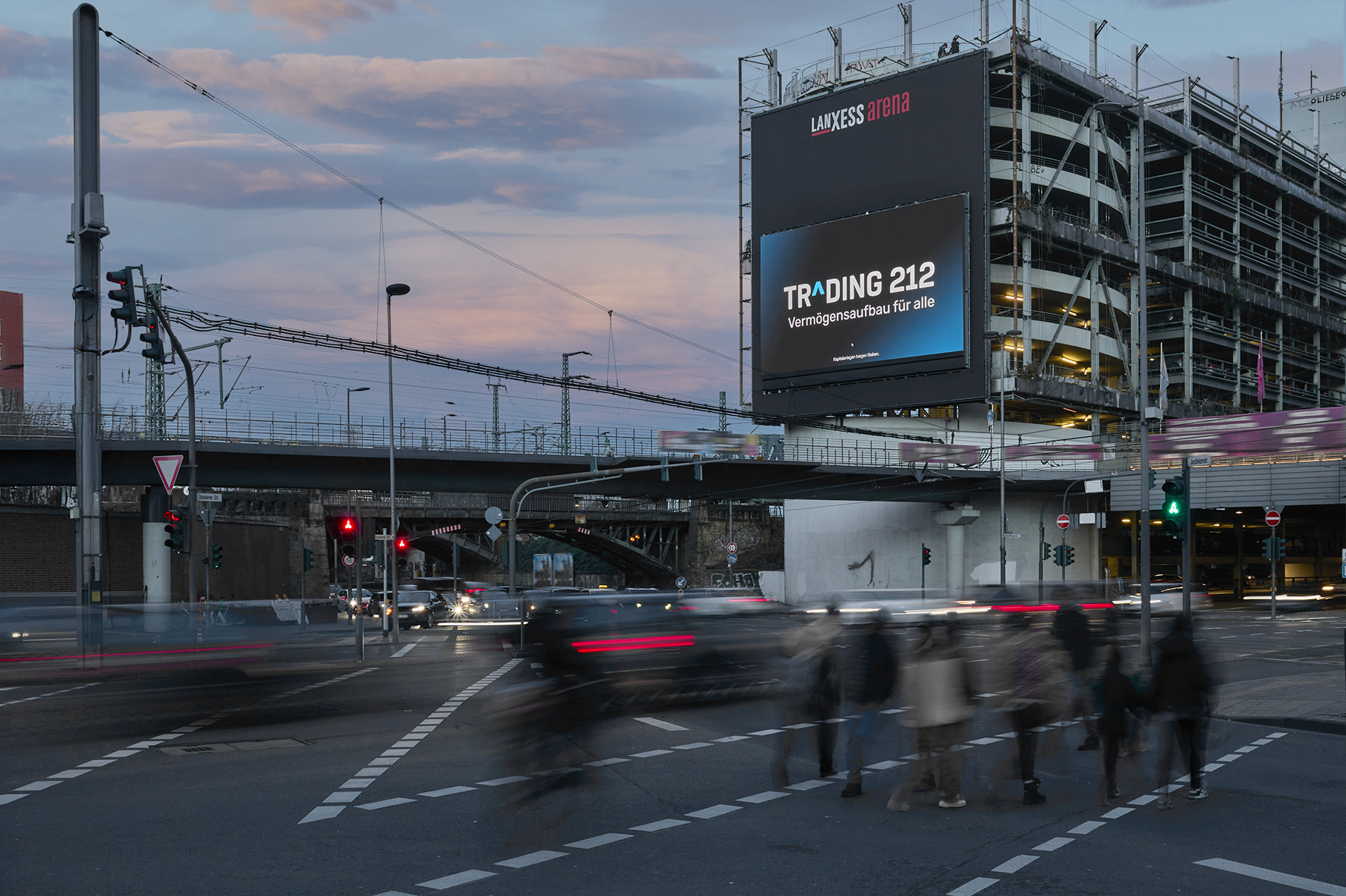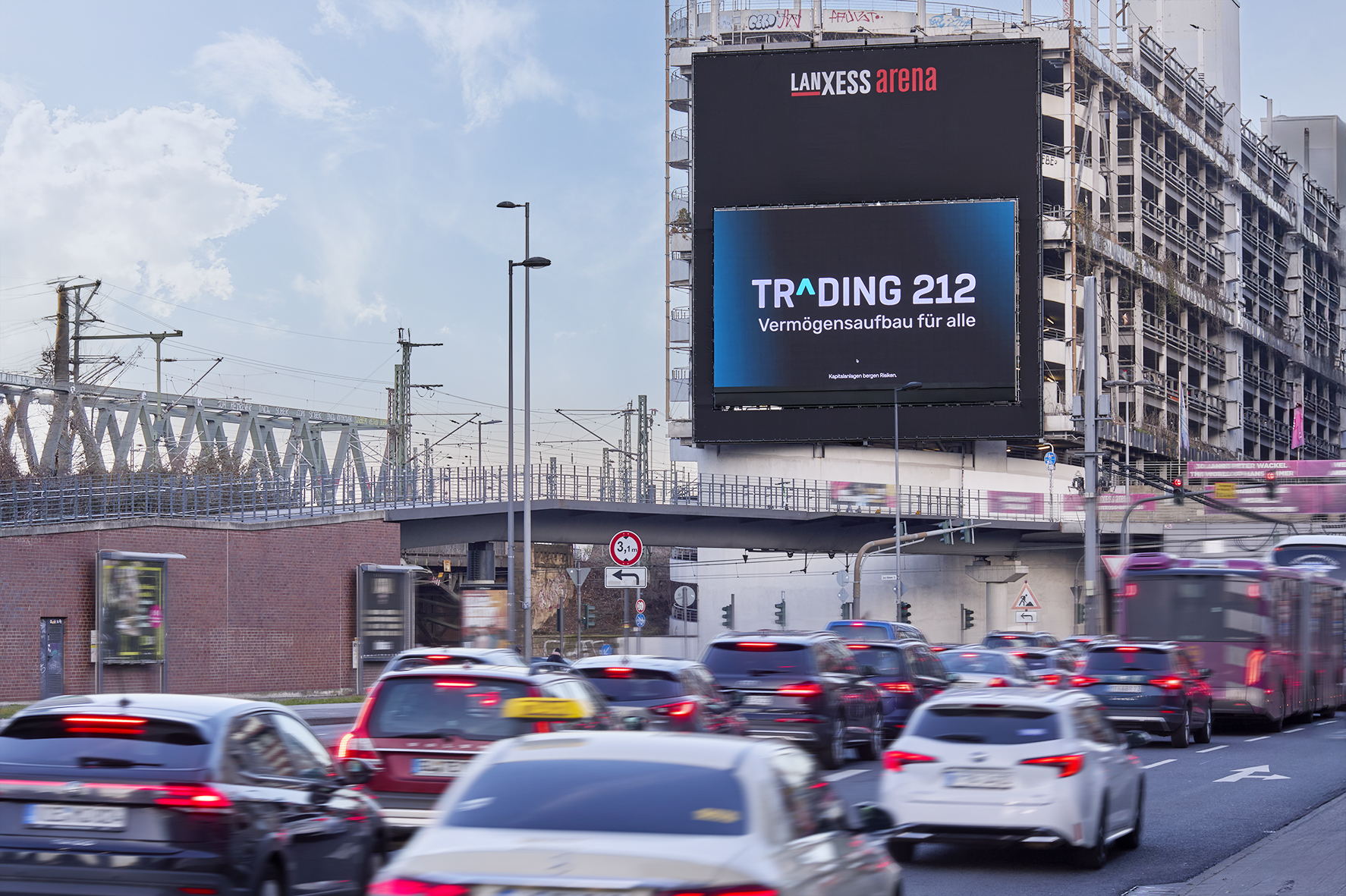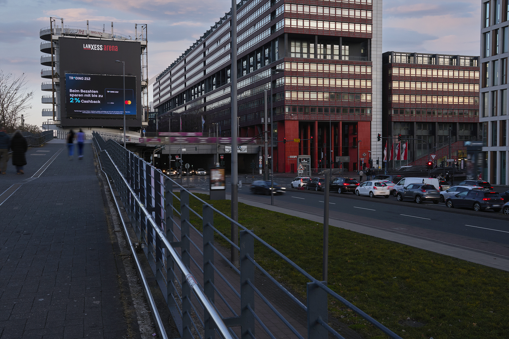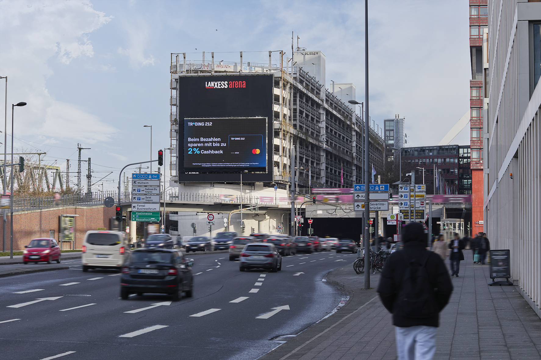 A milestone in Cologne: a nearly 100-square-meter LED highlight at the LANXESS Arena. Located directly at the transport hub in front of the LANXESS Arena and the Cologne Messe/Deutz ICE train station, this is one of Germany's largest DOOH screens. The screen, mounted on the parking garage facade of the LANXESS Arena, is visible from up to 300 meters away and also benefits from the traffic lights directly in front of it. Commuters head towards the train station, business professionals travel to the Cologne trade fair grounds, and night owls enjoy the diverse events at the arena.