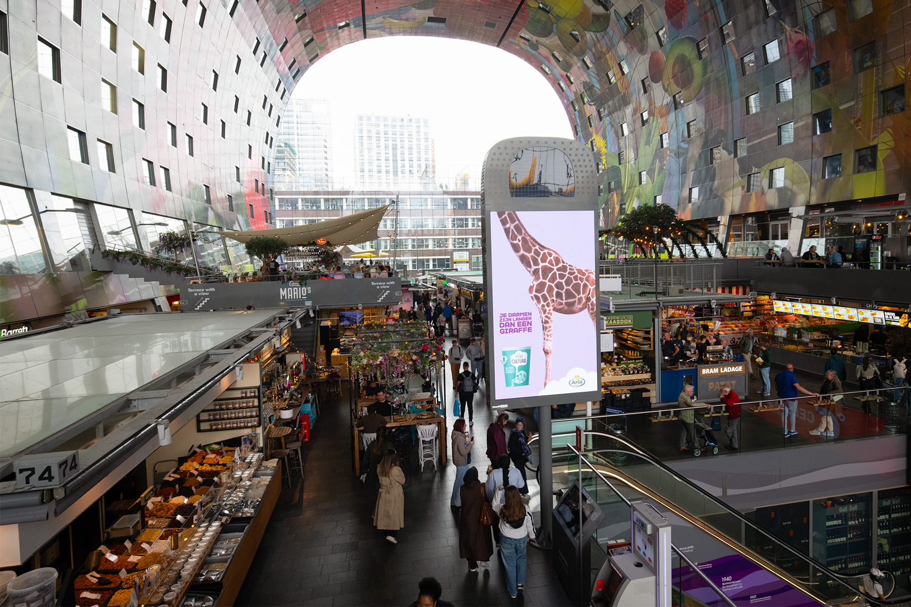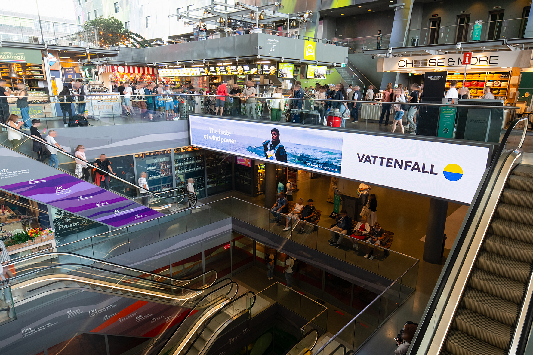 Tussen de kramen en restaurants bevinden zich twee premium digital out of home locaties. Samen hebben de schermen een totaalformaat van 30 m². De vrijstaande, tweezijdige Freestander staat centraal op de begane grond en valt op door hoogte en zichtbaarheid vanuit beide looprichtingen. De 12,5 meter brede LED Banner bevindt zich tegenover de roltrap naar de benedenverdieping en trekt de aandacht door zijn panoramische breedte.
