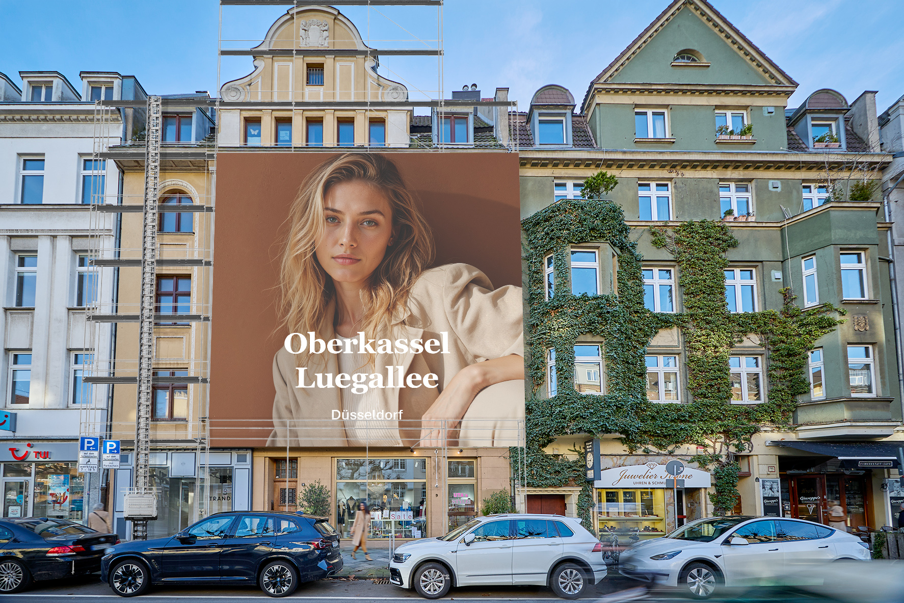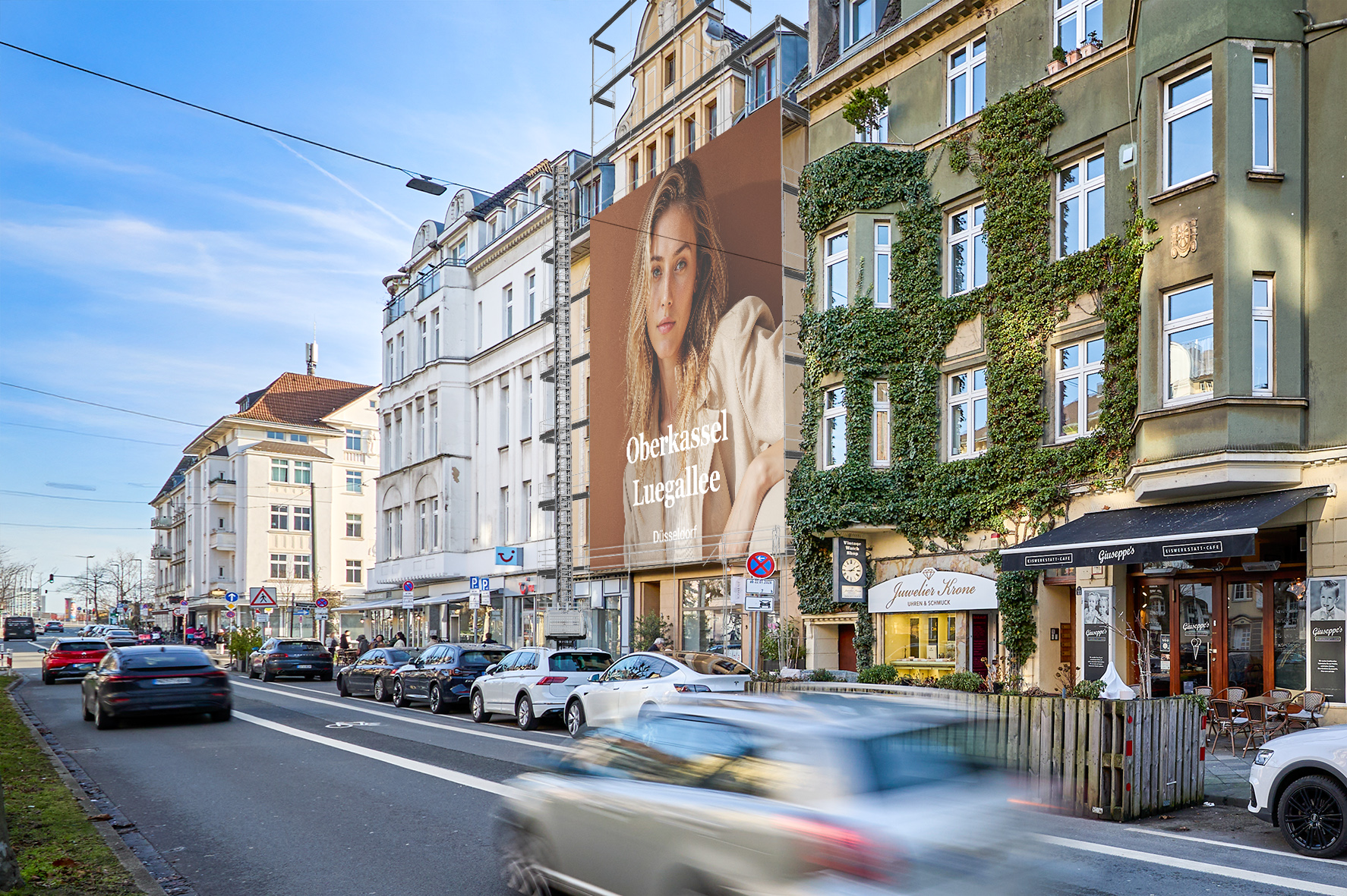A truly exceptional gem in the heart of Oberkassel - Düsseldorf's most prestigious district. Here, urban mobility meets sophisticated lifestyle. Amidst this premium environment, the giant poster makes its full impact: prominent, dominant, and impossible to miss. The combination of exclusive cafés and restaurants at the nearby Luegplatz and Belsenplatz makes the district a hub for those who appreciate a refined lifestyle. Oberkassel residents are drawn to Düsseldorf's city center or the popular Rhine promenade.