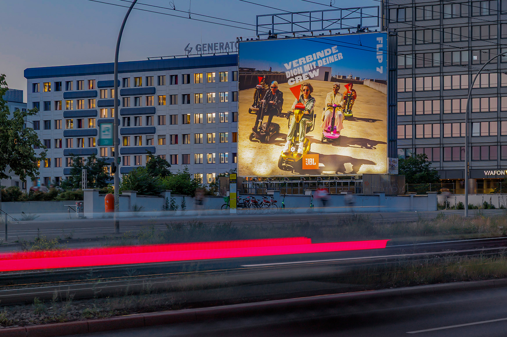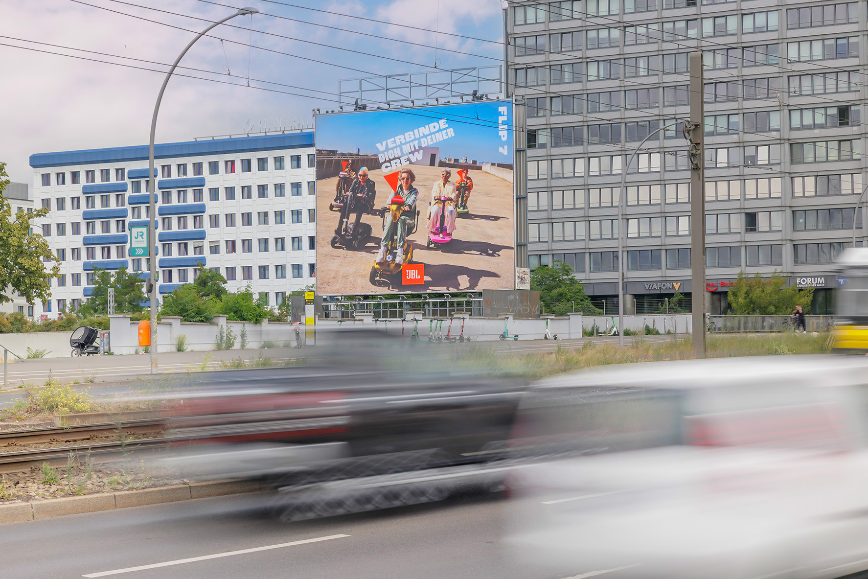 Colourful, lively and diverse - that's Prenzlauer Berg right by the famous Berlin event location Velodrom. Young, outgoing people and sports fans make their way past the Giant Poster towards Lichtenberg and the Velodrom, where concerts and major events regularly take place. The freestanding location of the Giant Poster on the highly frequented Landsberger Allee makes it very visible to the numerous motorists and pedestrians from a distance of over 500 metres.