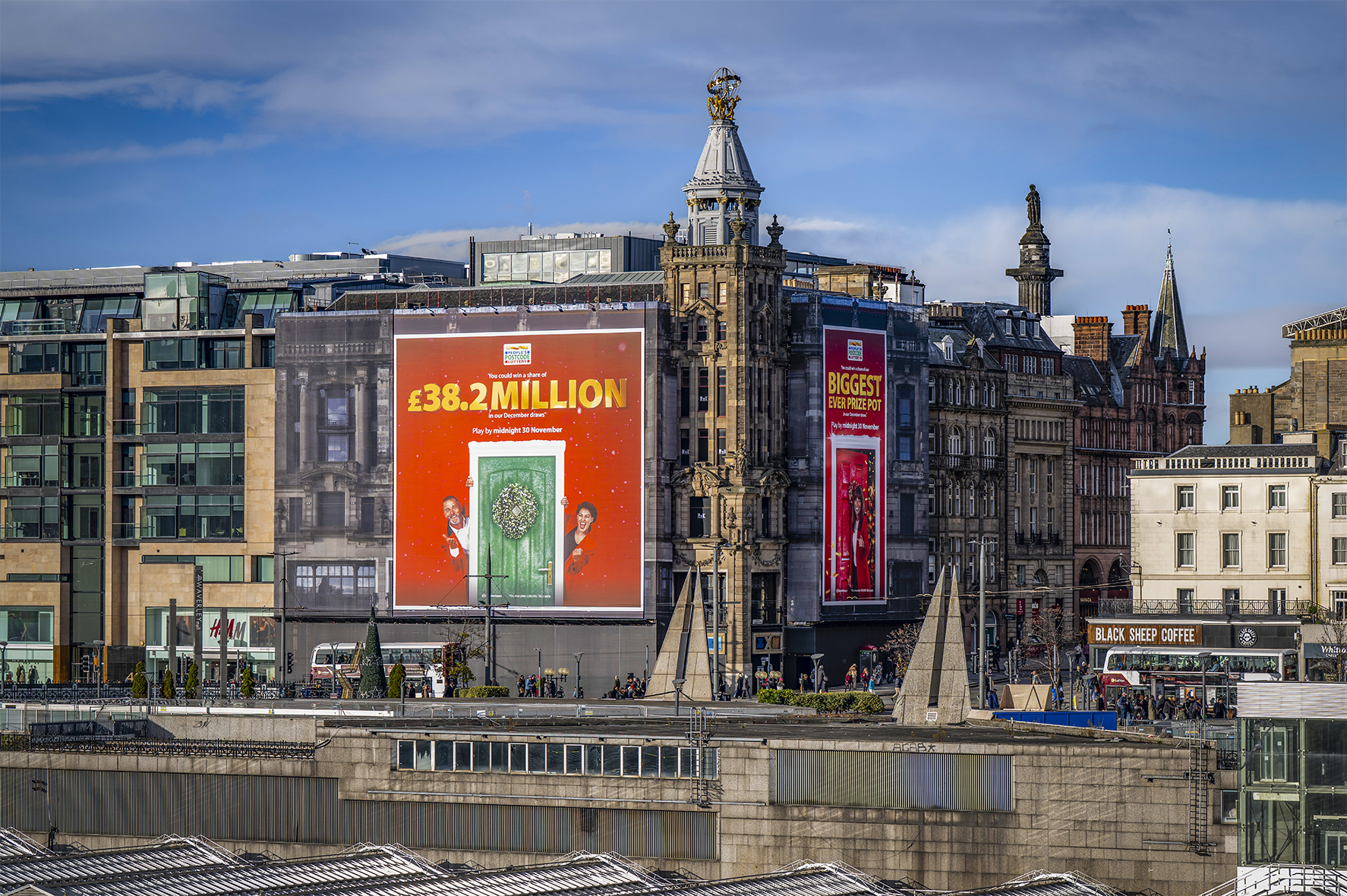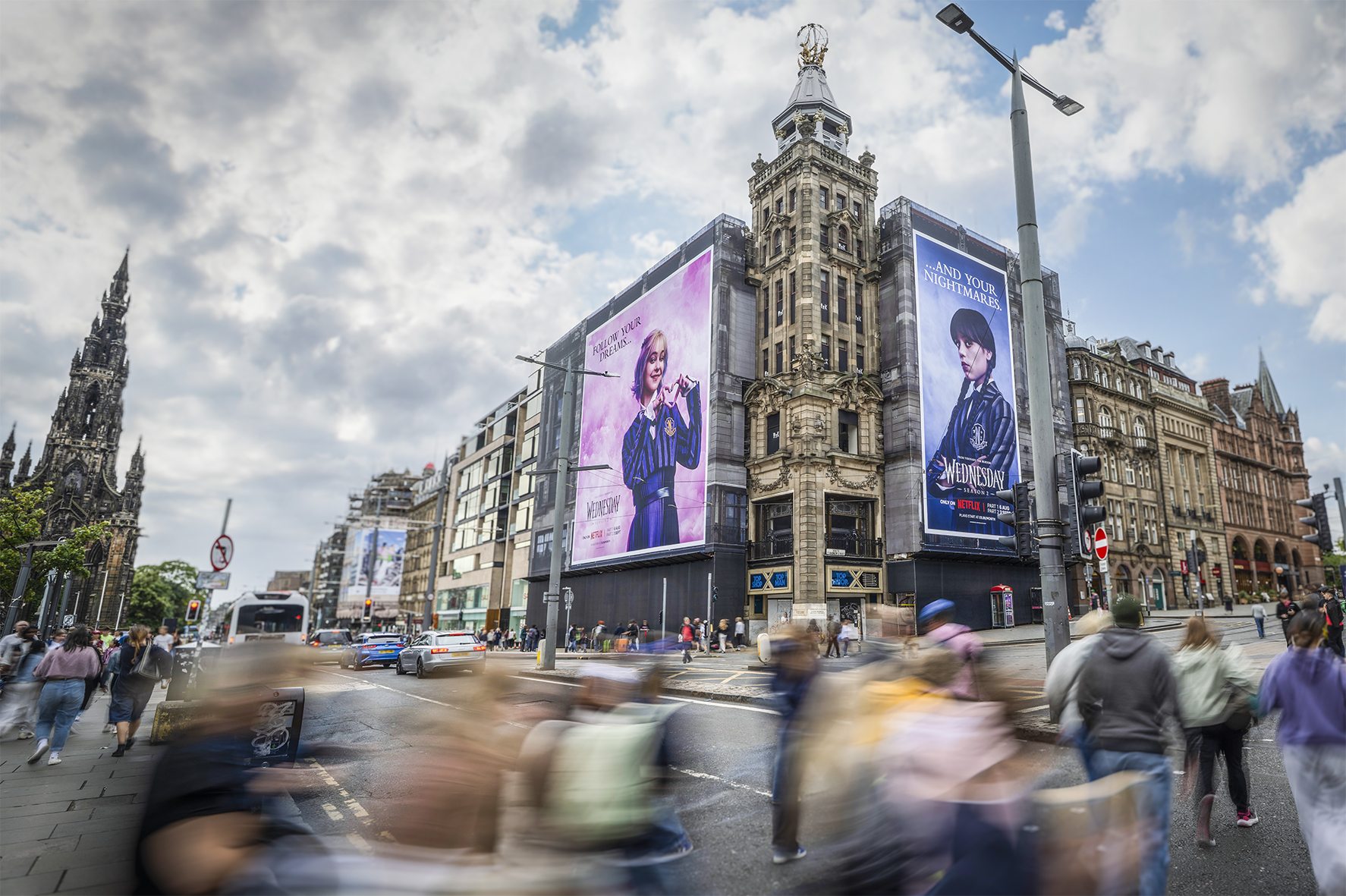 Our 509m² Princes Street Giant Poster is the most dominant banner positioned on Edinburgh’s main shopping street. This prime location is a hub for luxury retail, located near Multrees Walk, Edinburgh’s premier luxury shopping destination, home to Scotland’s only Harvey Nichols, Louis Vuitton, and a range of other exclusive fashion brands. Another key shopping destination is St James Quarter, a renowned complex offering world-class retailers, upscale bars, restaurants, and entertainment.