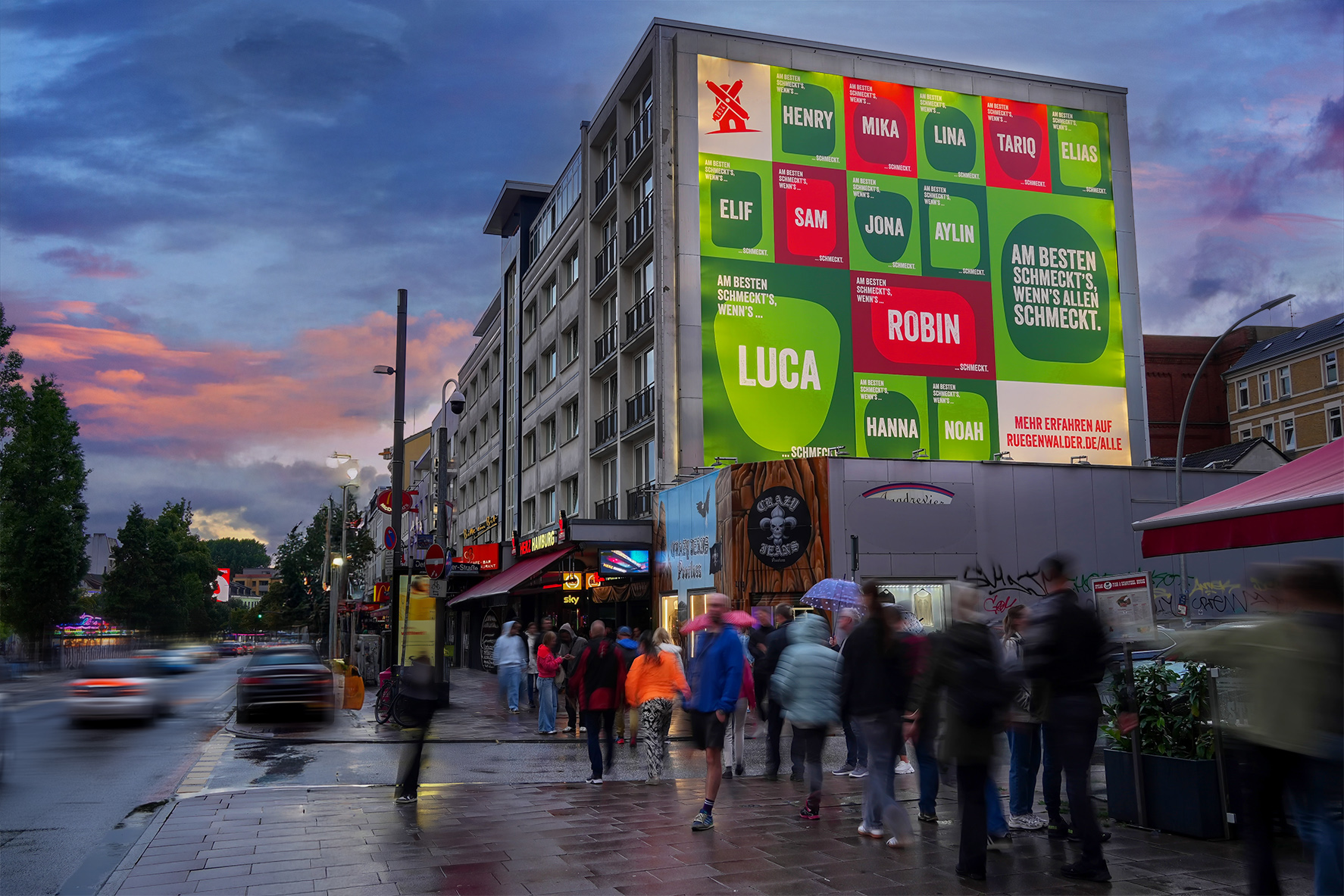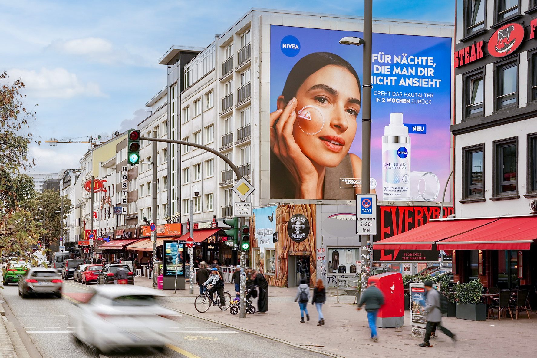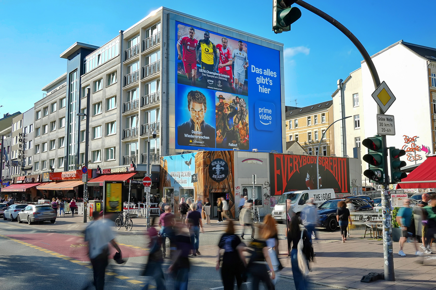 Branding in the middle of the Kiez! The city's most famous nightlife street, including its side streets, is the first port of call for Hamburg's in-crowd and nightlife enthusiasts. Young, fun-loving people are magically attracted to the cool bars, hip restaurants and nightclubs. Entertainment fans also enjoy spending the evening in one of the many theaters. A wide range of tourist magnets, such as the Panoptikum or Hamburg Cathedral, provide additional opportunities for fun in the heart of Hamburg. The Giant Poster is illuminated from behind and is an absolute eye-catcher, especially at night.