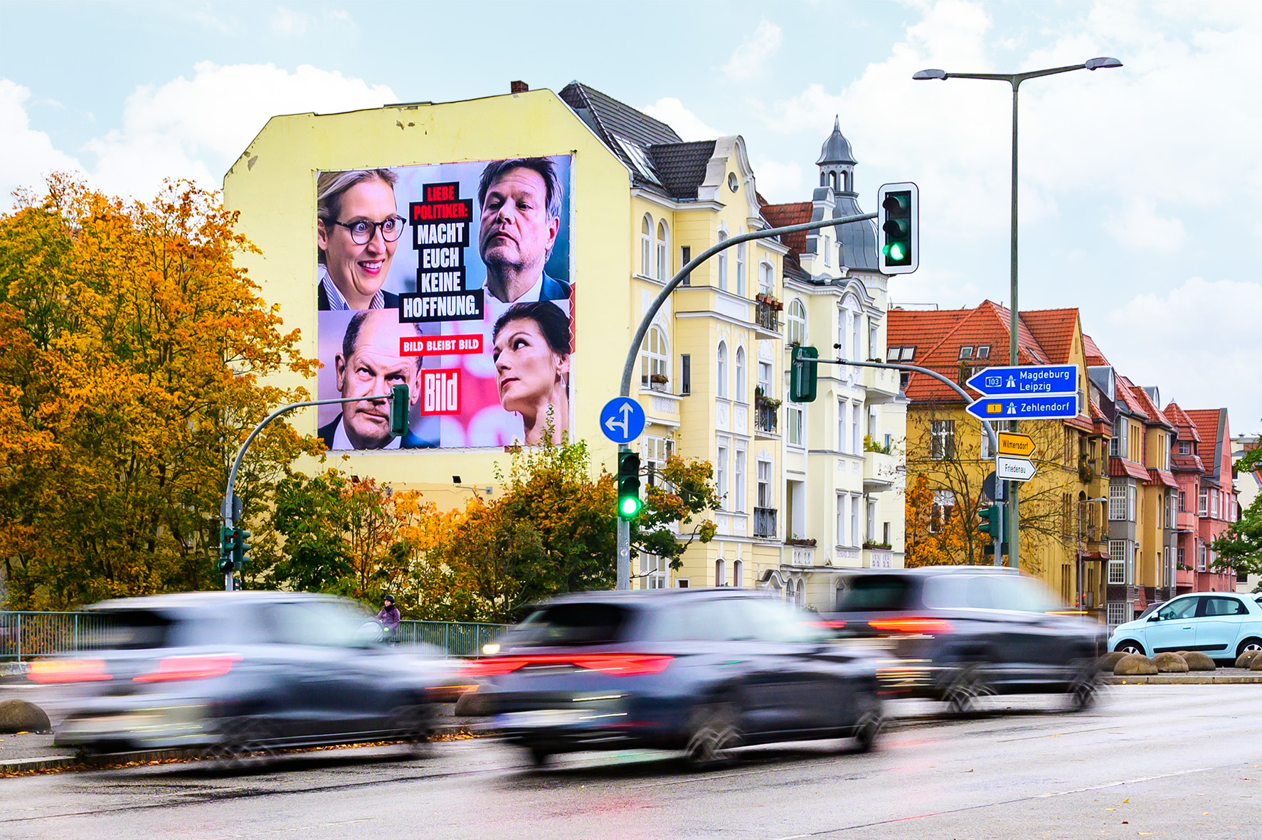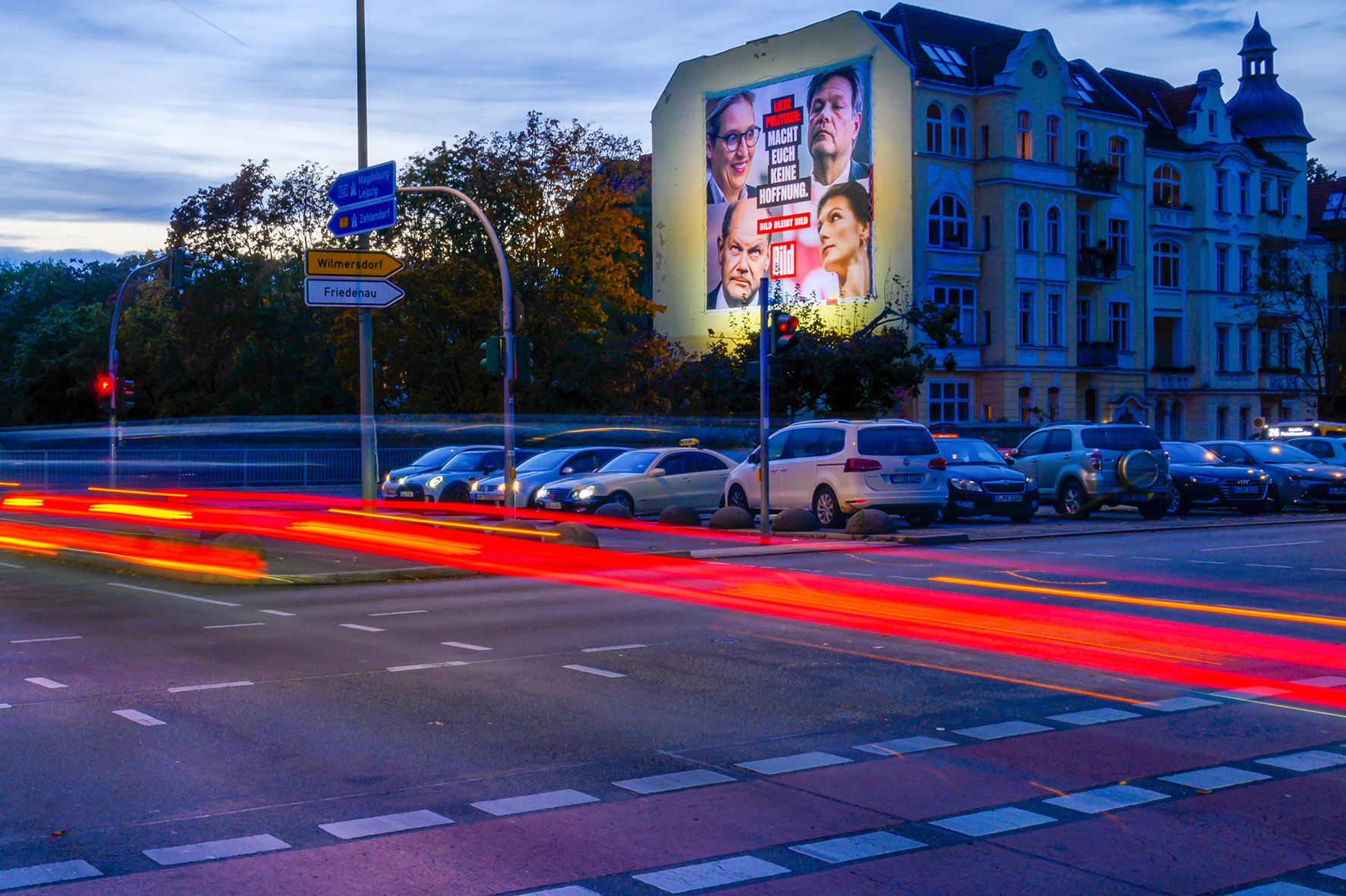 This BlowUP offers optimum visibility from a long distance. Located on Saarstraße in Berlin’s Friedenau neighbourhood, it faces city-bound traffic heading in the direction of the nearby City West district, with its shopping hotspots Kurfürstendamm, KaDeWe and many others. Friedenau is part of the trendy Tempelhof-Schöneberg borough. Known as an artist’s paradise and an idyllic place to live, it is one of the most popular upmarket residential areas in the city. The educated middle class has always settled here, making Friedenau a very special place to be. More and more young and well-to-do families are coming to appreciate this idyllic, creative district. The streets are lined with owner-managed shops, galleries and artists’ studios. There are numerous shopping streets in the immediate vicinity of the BlowUP, including Hauptstraße and Rheinstraße. Along with the many shops, boutiques, restaurants and bars, these streets are a magnet for shopping fans.