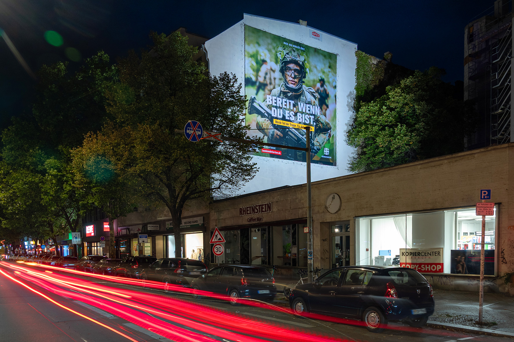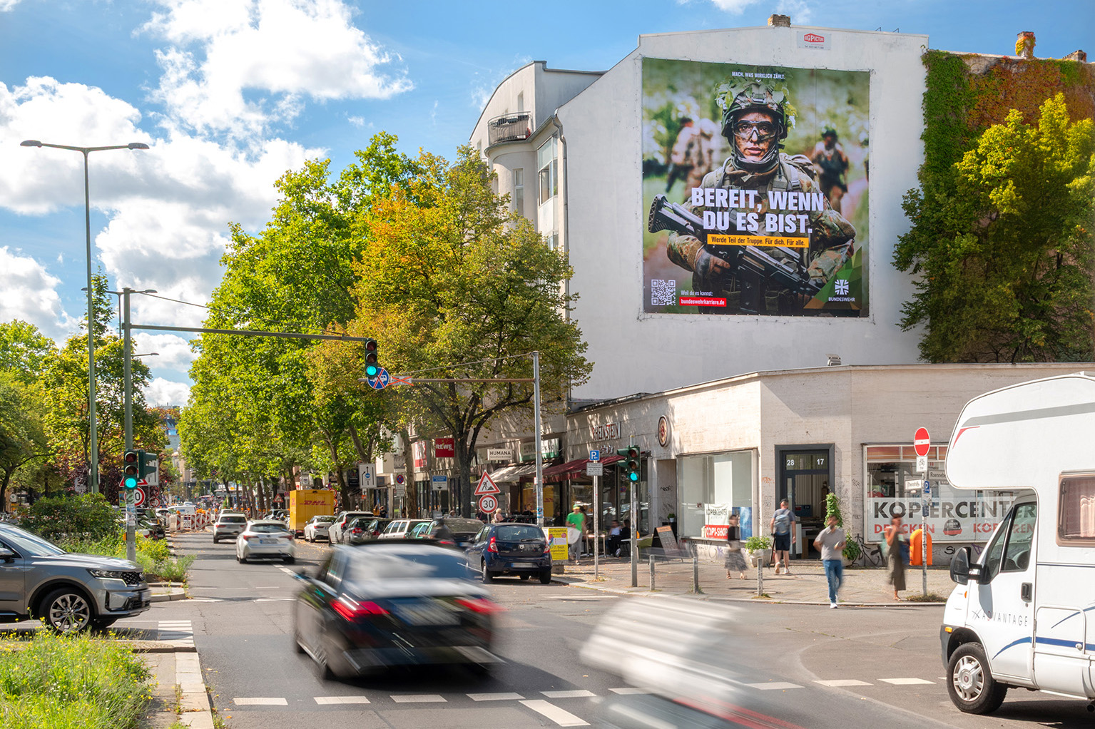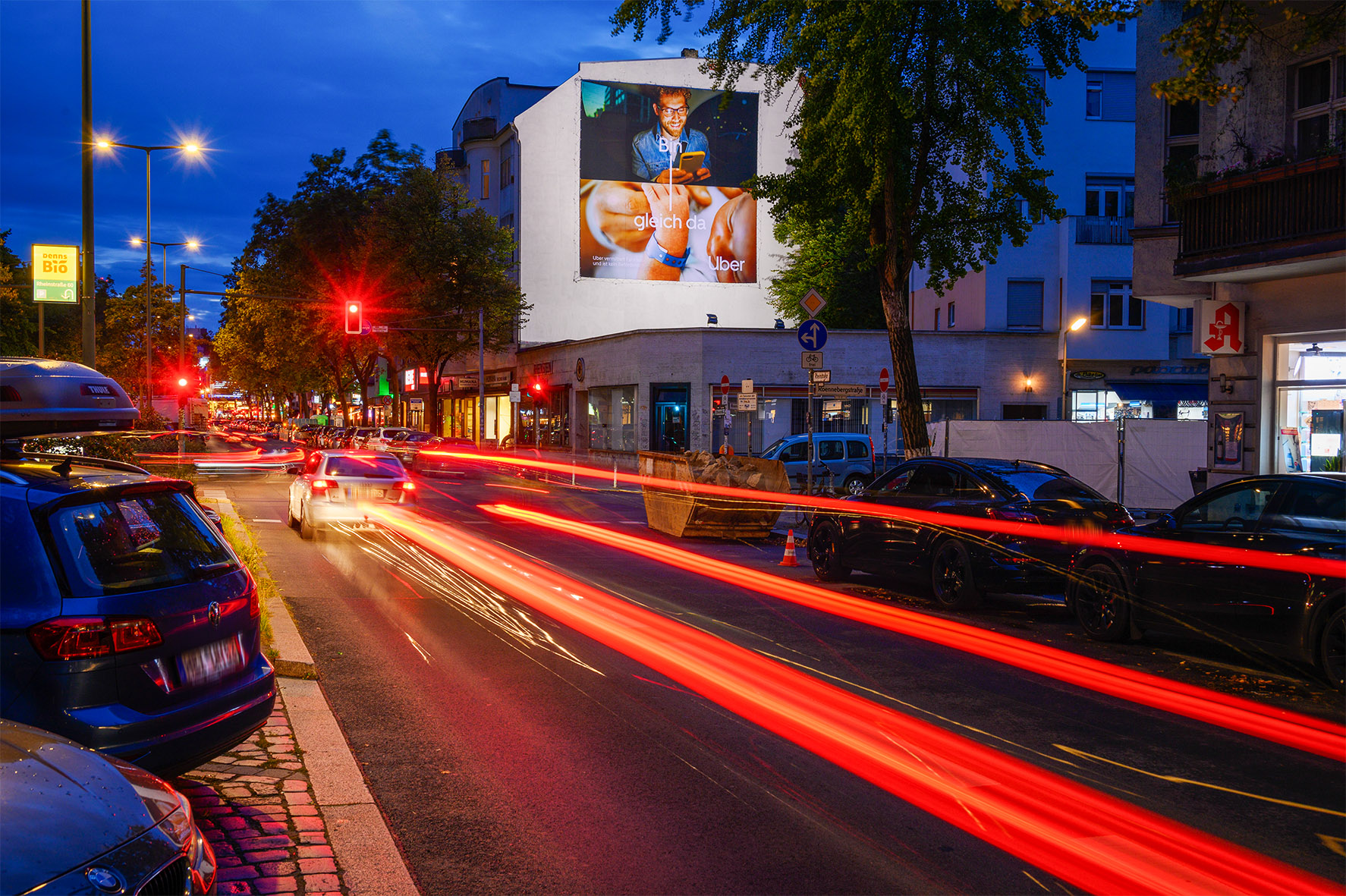 Located in the popular Tempelhof-Schöneberg district, this Giant Poster overlooks the Rheinstraße between Friedenau and Steglitz. This highly frequented traffic axis provides a direct route from the city centre to the south of Berlin. This is the gateway to the shopping heart of Berlin-Steglitz – just a few metres away lies the Schloßstraße, one of the city’s most popular shopping streets and Berlin’s largest retail location with 200,000 m² of retail space. Shopping centres, fashion stores and well-known brand stores line the street, making it a magnet for trendy and well-to-do people from Berlin as well as tourists. Part big city bustle, part suburban calm – the Friedenau neighbourhood is situated next to Schloßstraße and offers beautiful old buildings, galleries, small cafés and design stores, making it especially popular with young families, artists, creatives and students alike.