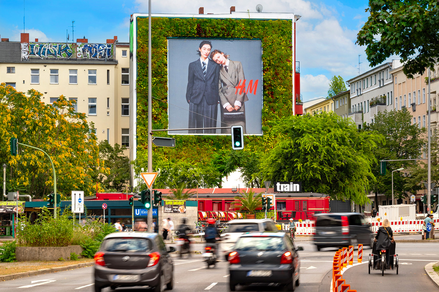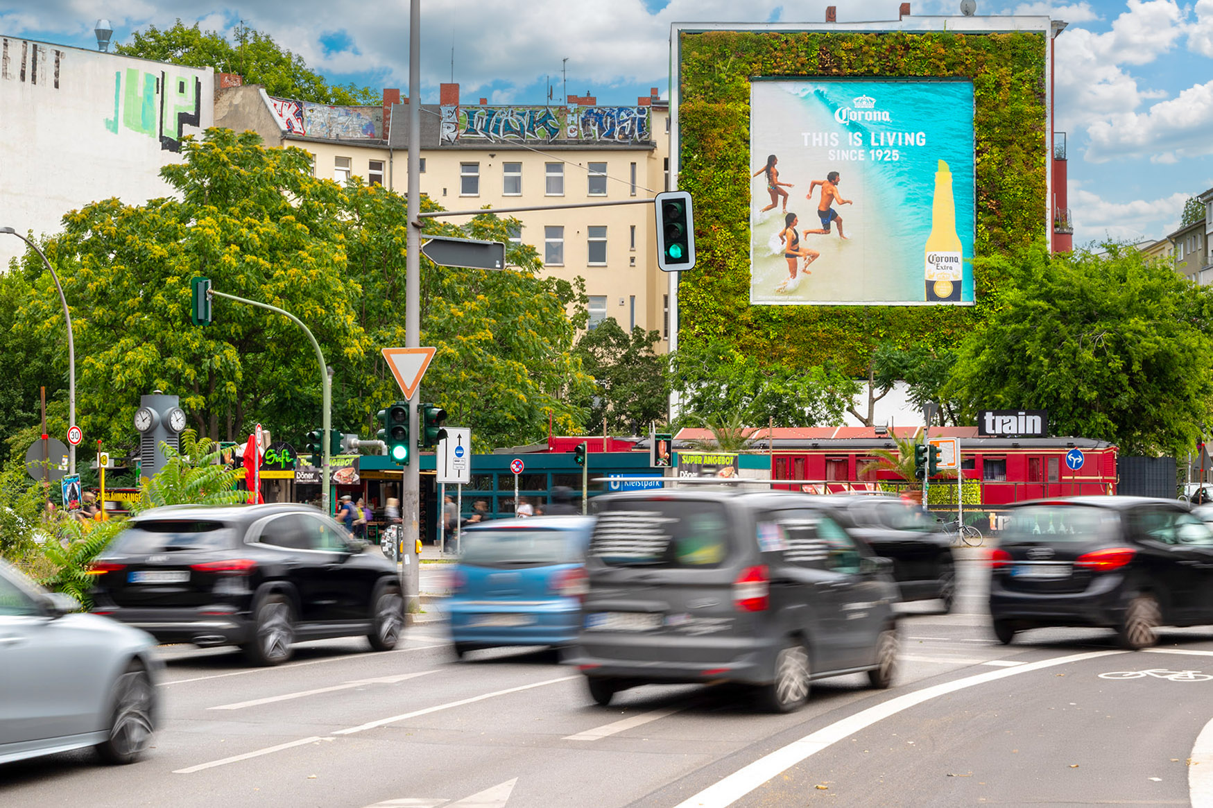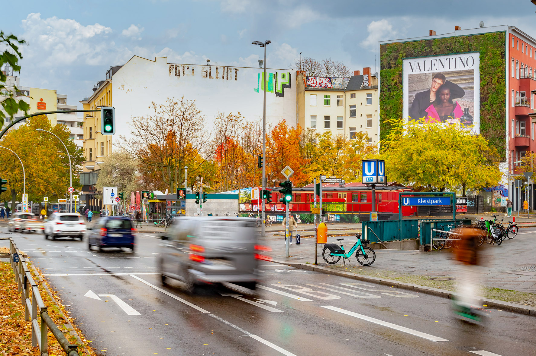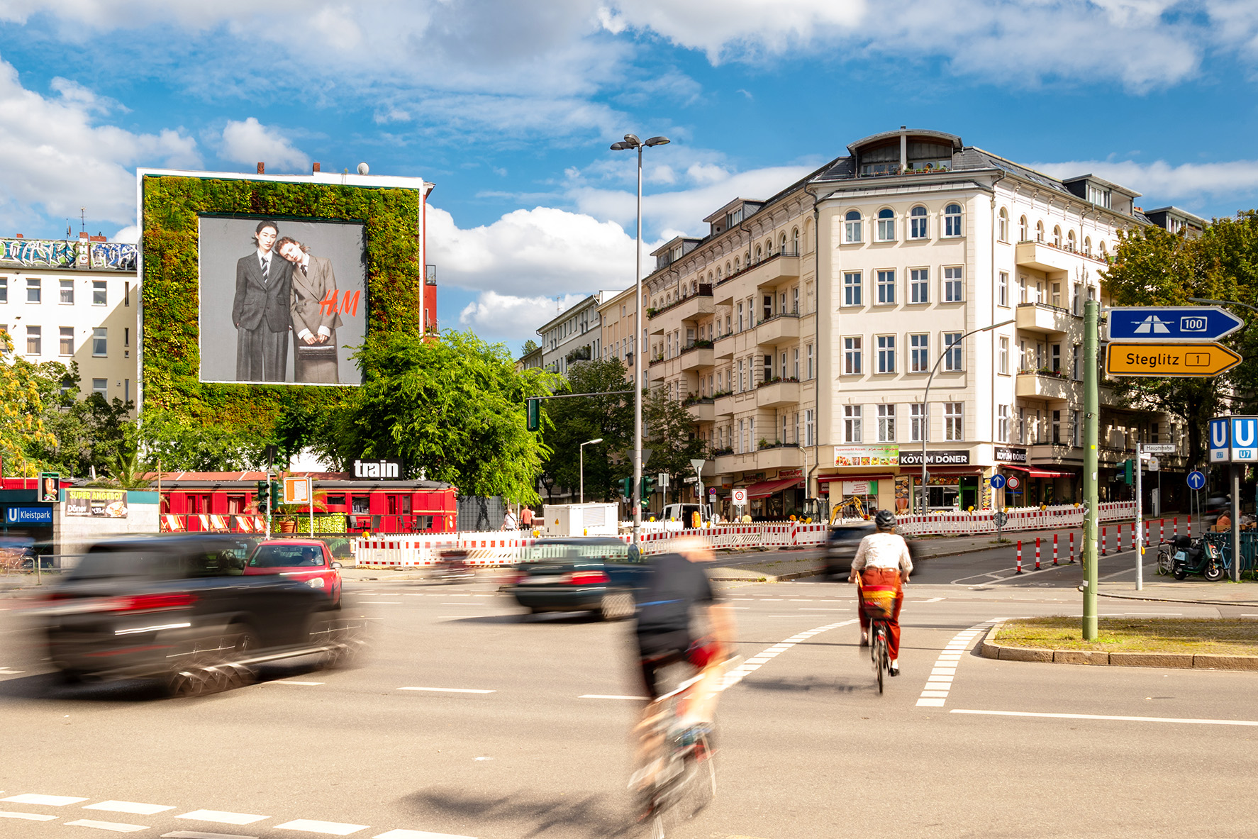 A green highlight in Berlin Schöneberg! Directly at Kleistpark, around 12,000 plants frame the Giant Poster and bring green life to the trendy district. This is where you meet students and early adopters in search of new inspiration. Berlin life pulsates around The Green, trends are born here. Sports clubs train in the Kleistpark, the start-up scene meets in the bars. The large intersection is a traffic hub in the direction of Potsdamer Platz and the Schöneberg motorway intersection. With the Vertical Garden® and the air-purifying "The Pure" coating, brands create a symbiosis of high-impact brand presence and sustainability here.