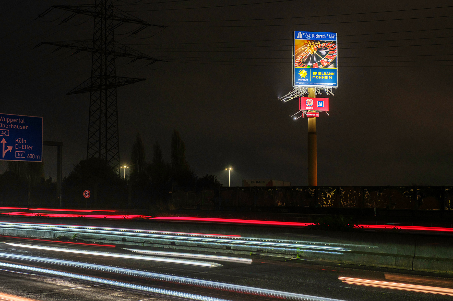 This unmissable, 50 meter high Traffic Tower shines on Düsseldorf's A46, one of the most important access roads into and out of the city. Düsseldorf, known for fashion, business, art and culture, is one of the trendiest and most affluent cities in Germany. The target group that frequents our Traffic Tower in the direction of Cologne is correspondingly top-class: creative opinion leaders and decision-makers, well-off business people, young fashion fans and trendy people interested in art and culture. Overall, people in Düsseldorf lead a sophisticated and pleasure-oriented lifestyle. Our optimally visible Traffic Tower has an effect on drivers in the "flow" of driving and is particularly busy in the mornings and evenings during rush hour - with an impressive 3.9 million contacts per month! In the immediate vicinity of the tower: crowd pullers such as Ikea, hardware stores, the exclusive gourmet temple Zurheide, the event location Castello and the trampoline park Superfly.