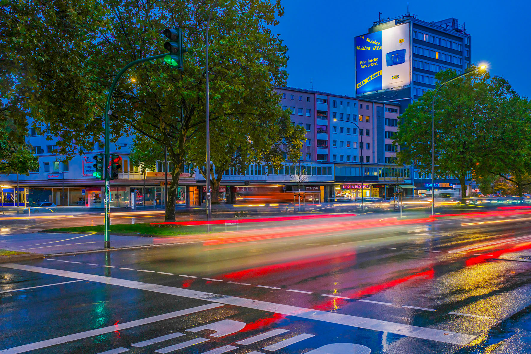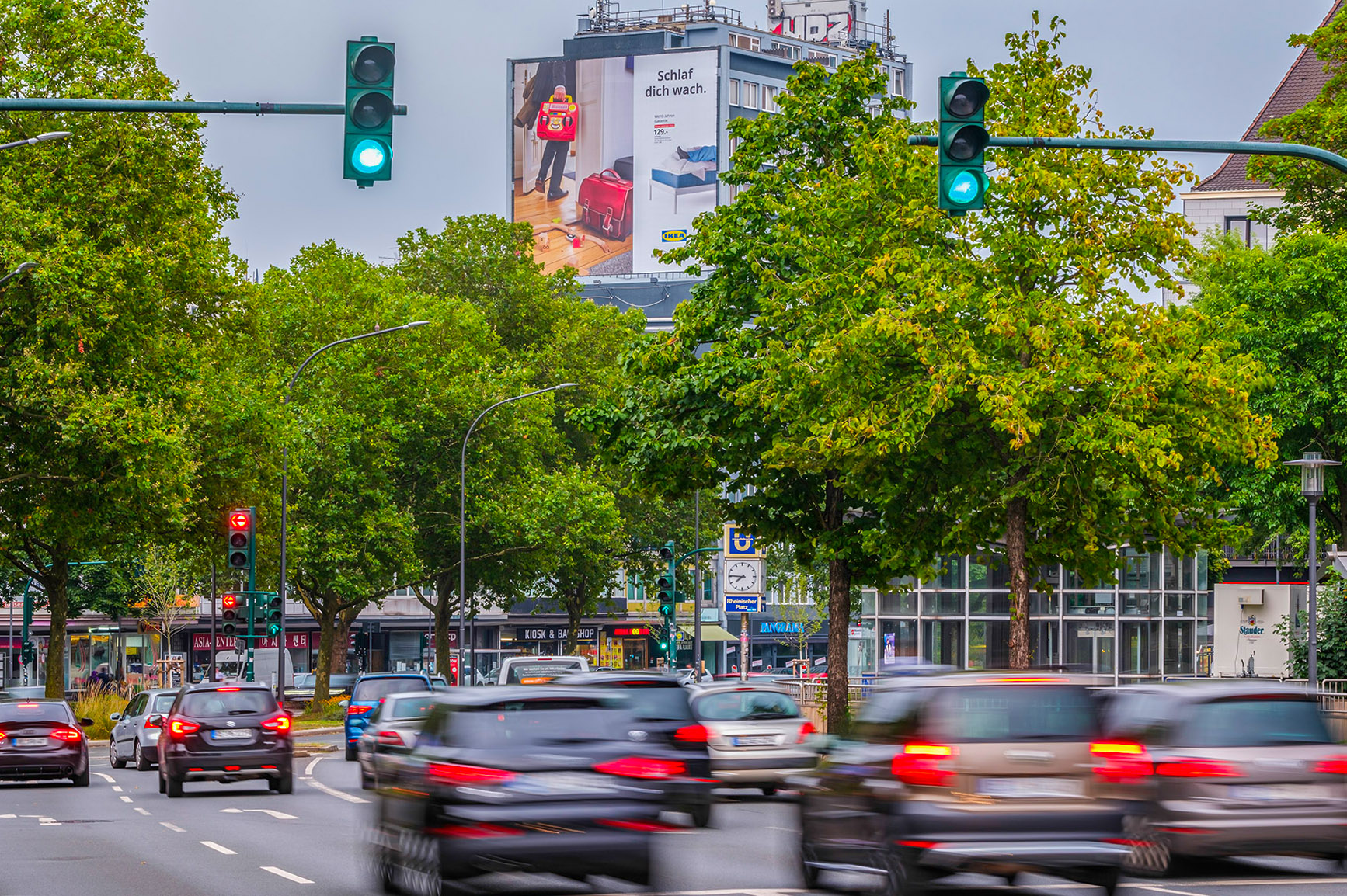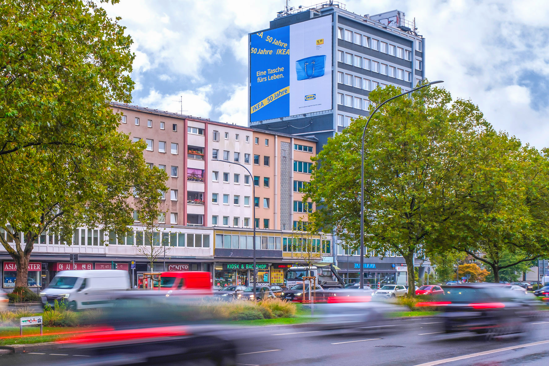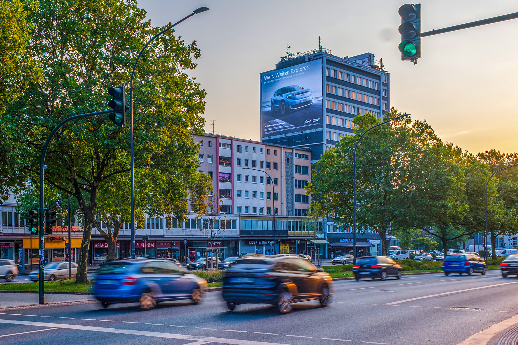 Landscape location in the city centre of Essen. Located on the key city centre traffic route, resulting in very high traffic volume. Directly across from the Viehofer Platz. Public transport stops in the immediate vicinity. Nearby: Numerous cafés, restaurants, bars, discos and the pedestrian zone with many businesses and chain outlets.