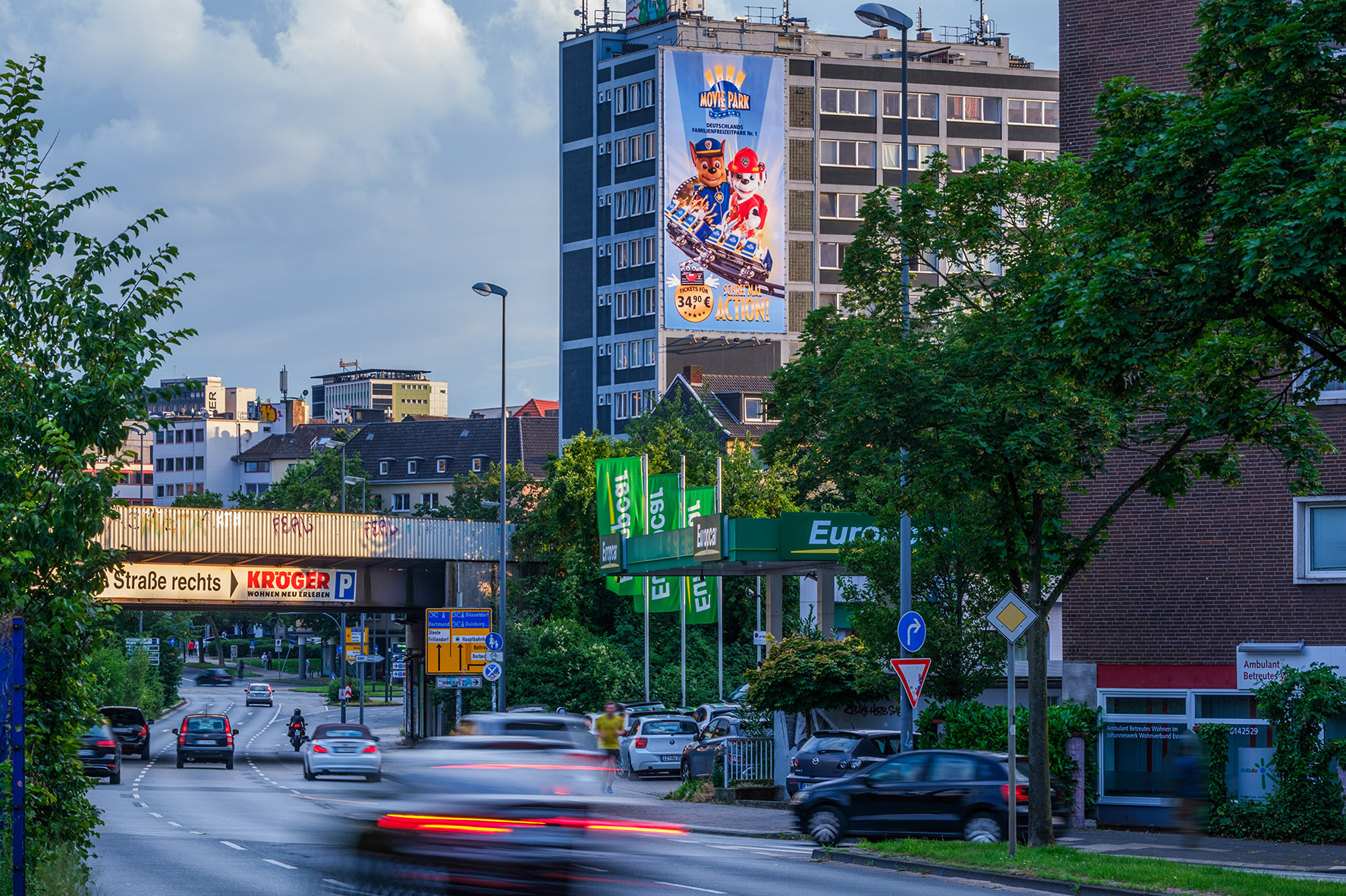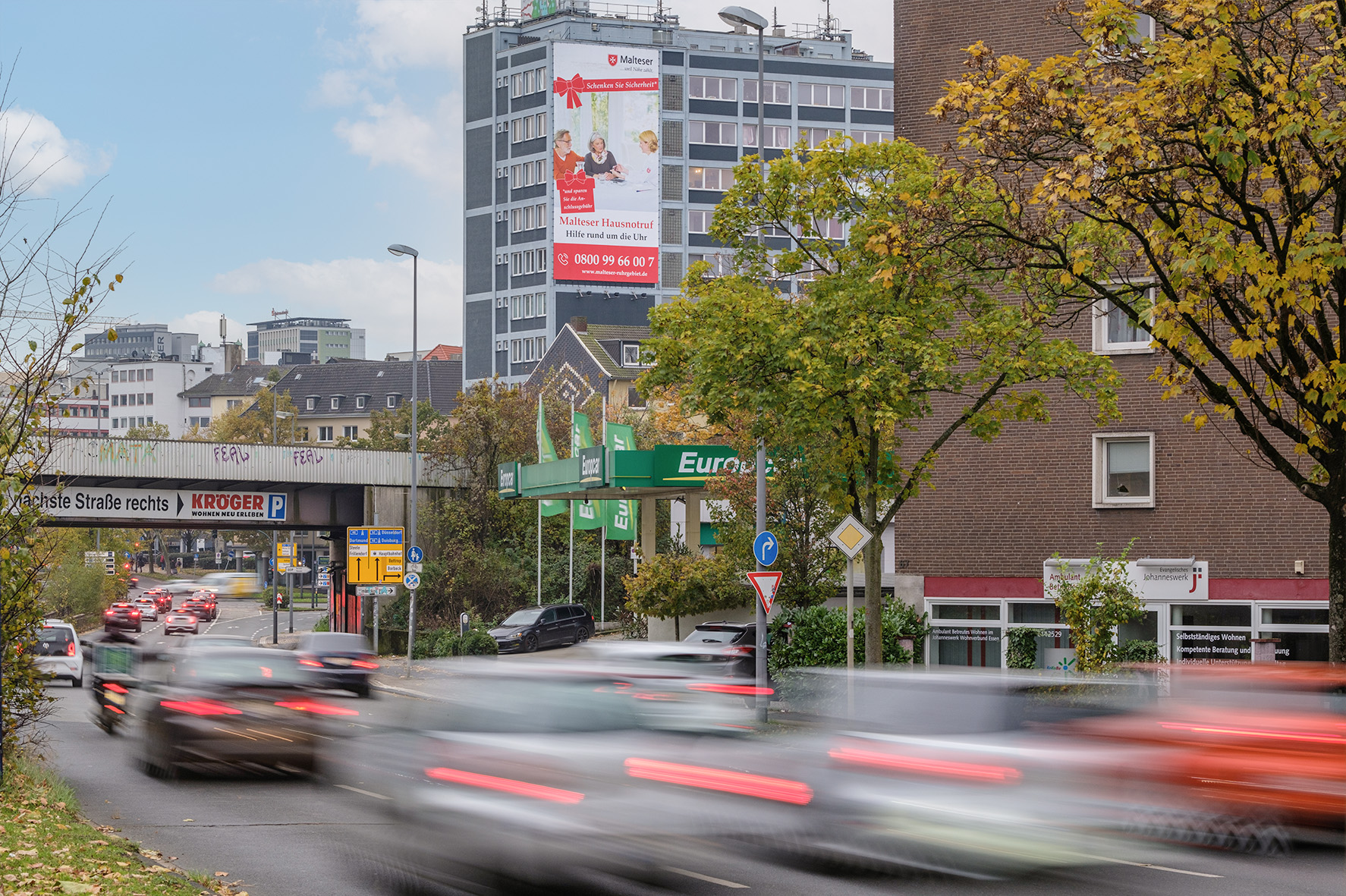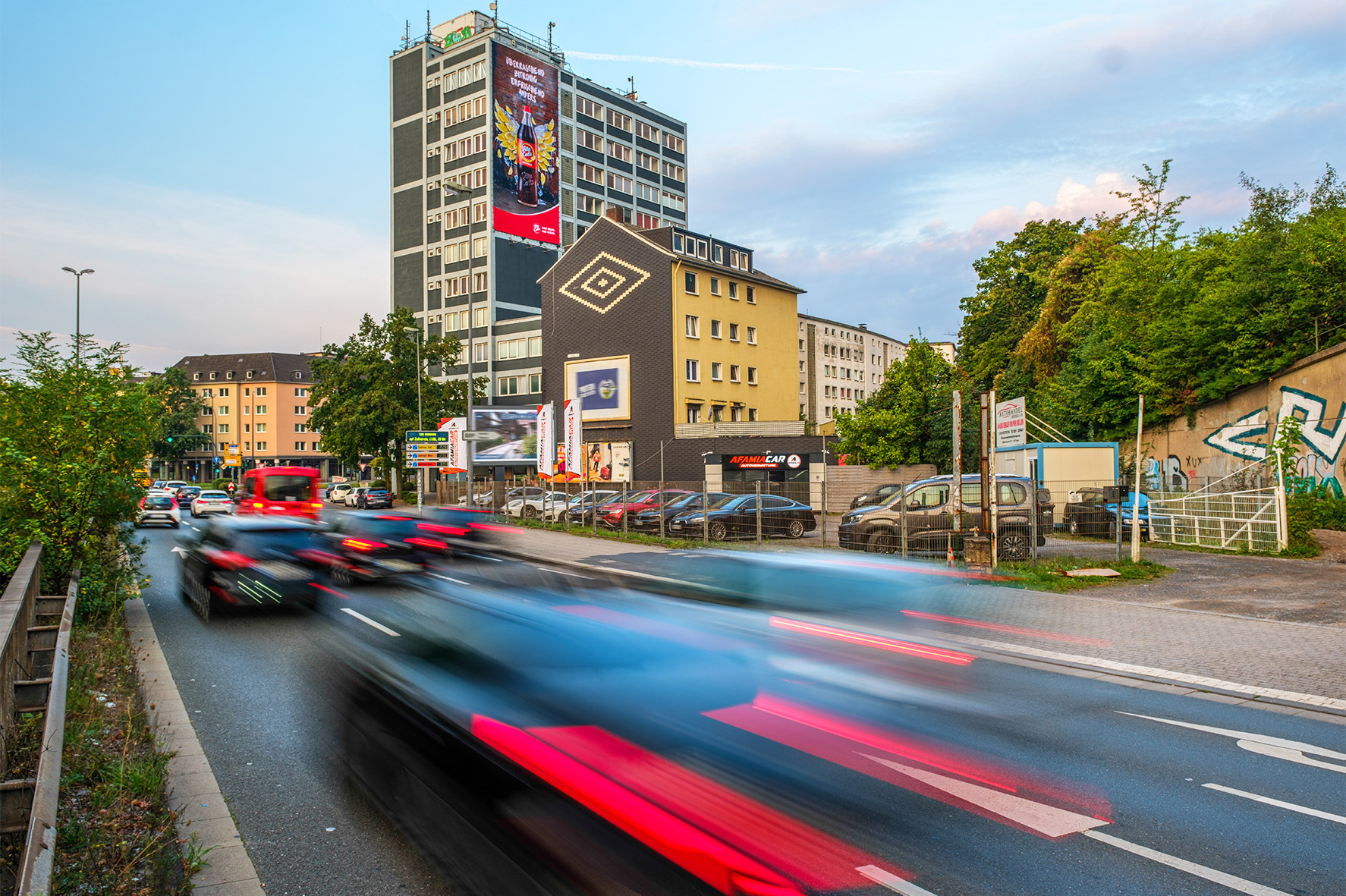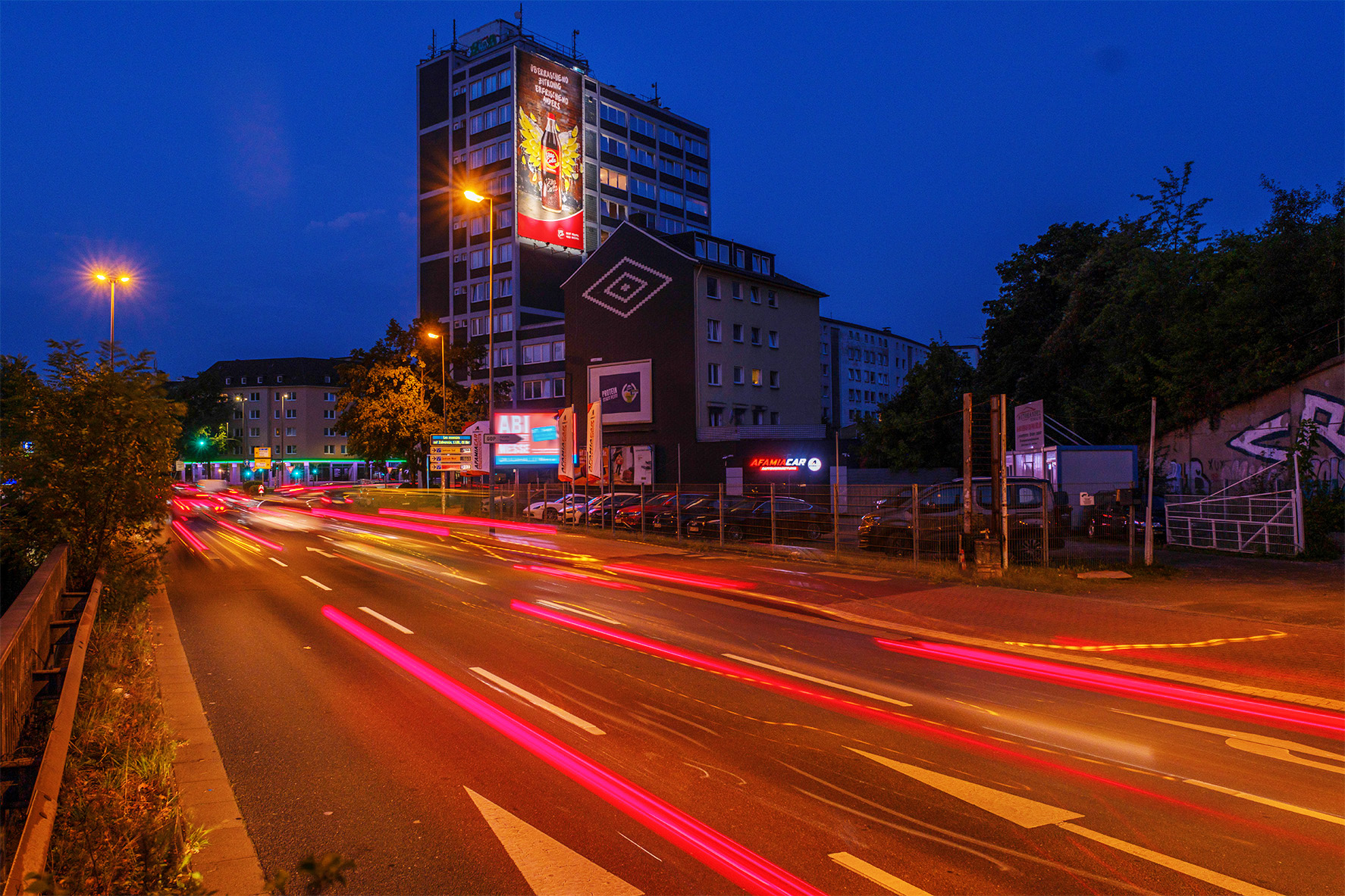 Impressive BlowUP in Essen’s city centre, located on Schützenbahn, one of the inner city’s most important arteries. Schützenbahn connects Viehofer Platz and the city’s main station. Viehofer Platz boasts numerous cafés, restaurants, bars, nightclubs and the GOP theatre, and is at the start of a pedestrian area that features countless stores and retailers. The adjacent traffic lights cause frequent tailbacks, guaranteeing long viewing times. The Limbecker Platz and Rathaus Galerie shopping centres are in the immediate vicinity. With 70,000 square metres of retail space and more than 200 shops, Limbecker Platz is one of the largest city-centre shopping malls in Germany. A second BlowUP (Viehofer Platz, Innenstadtring) on the building, which is visible to traffic traveling along Innenstadtring, can also be booked to round out the campaign.