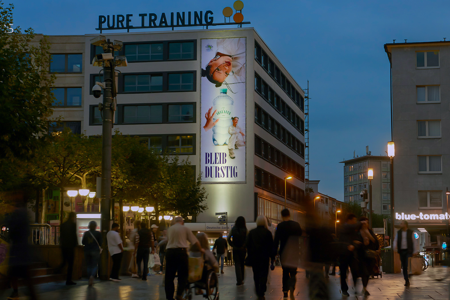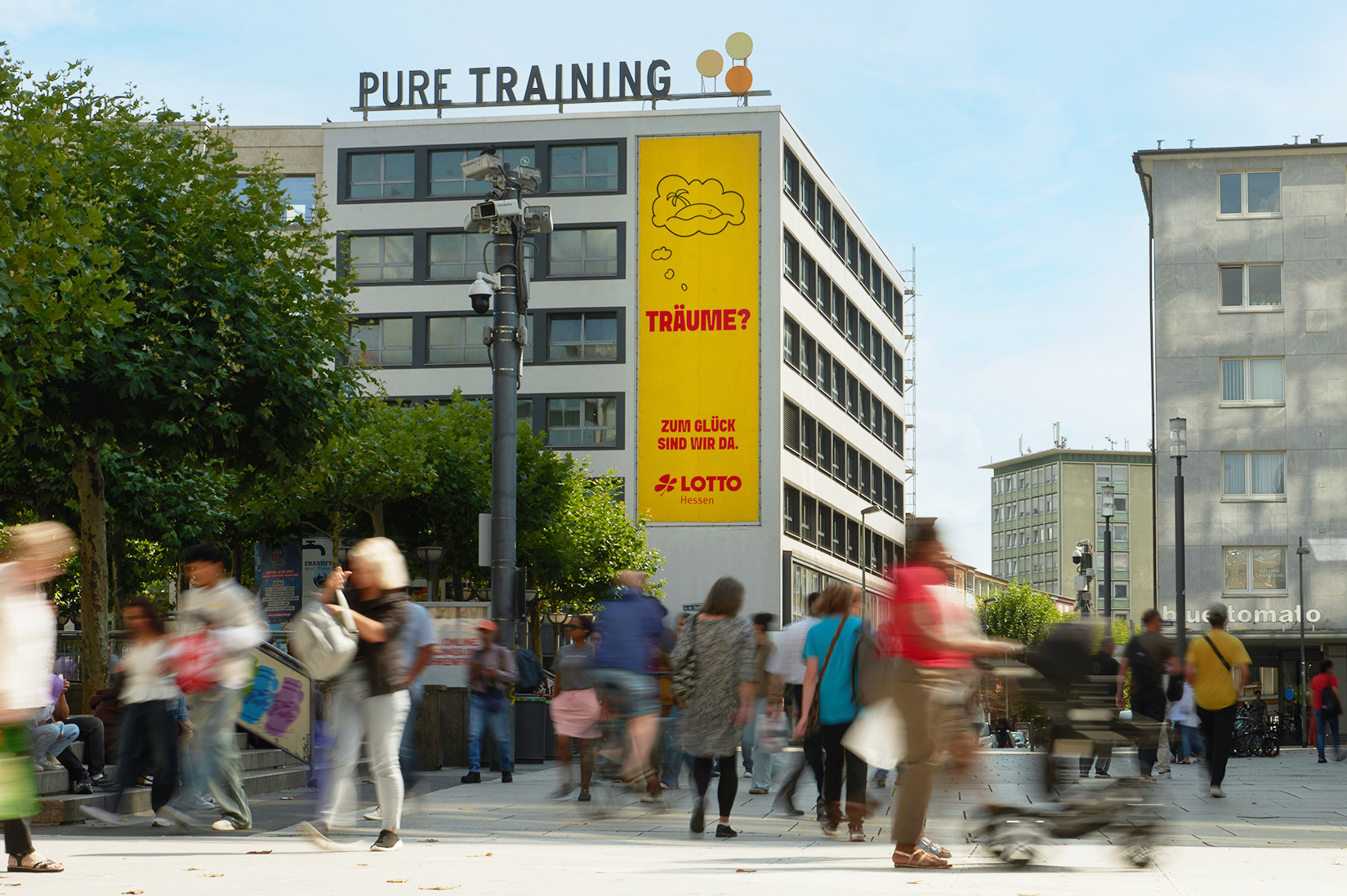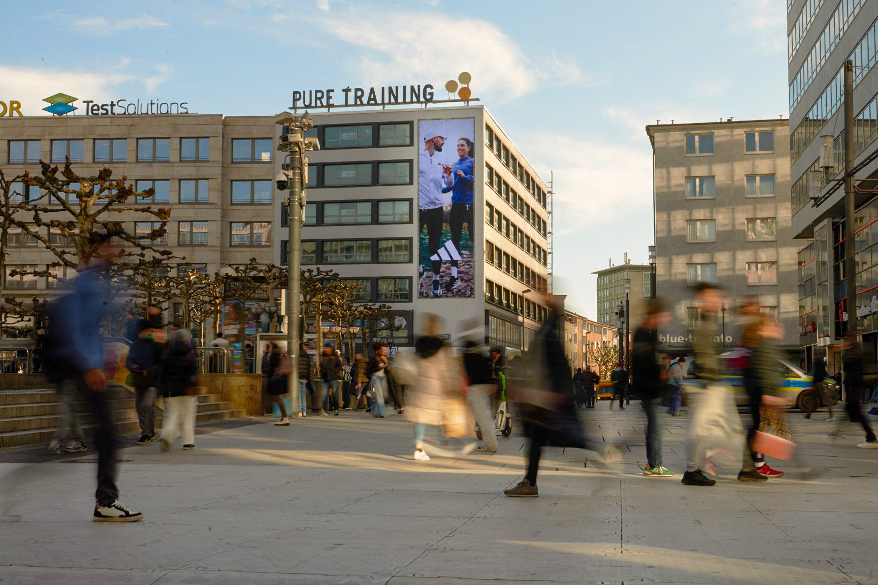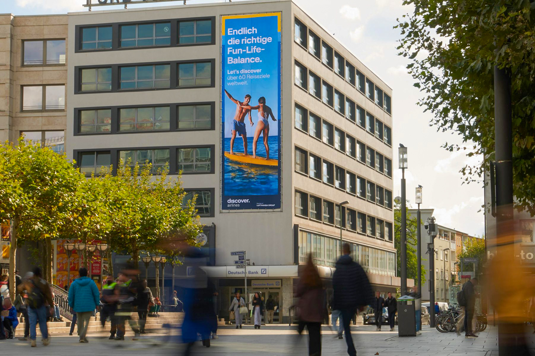 All eyes on you! This Giant Poster is located on Frankfurt's Zeil, Germany's busiest and most profitable shopping street. Directly at the Konstablerwache, the BlowUP covers the entire square. With a pedestrian frequency of up to 119,000 people per day, locals, city shoppers, commuters and tourists stroll here. In the immediate vicinity: the MyZeil shopping center, well-known sights such as St. Paul's Church and the Römer (town hall), nightclubs, restaurants and cafés. Additional traffic is generated by the weekly market, which takes place twice a week, and by the nearby U-Bahn and S-Bahn stations.